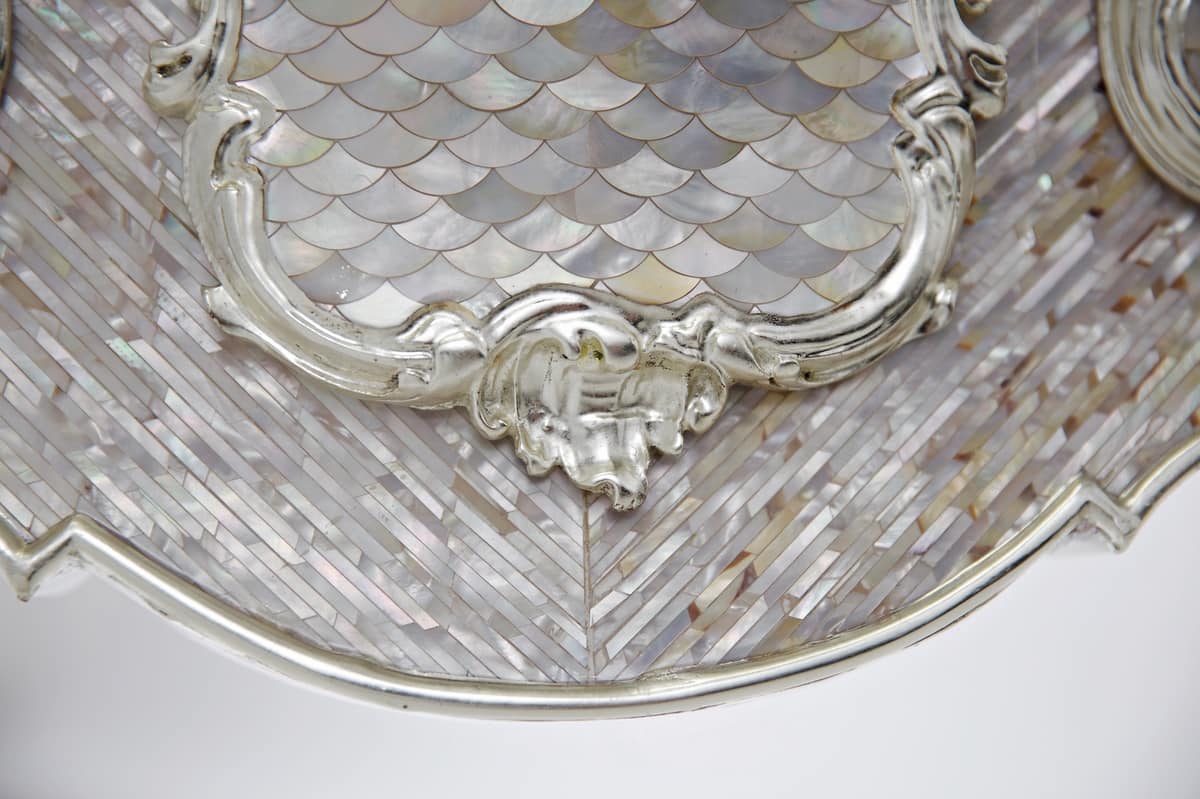 Les inlays floraux émergent sinueusement, et ses volumes élaborés se dissolvent dans la surface lisse des pétres de nacre, et tous viennent gracieusement ensemble.