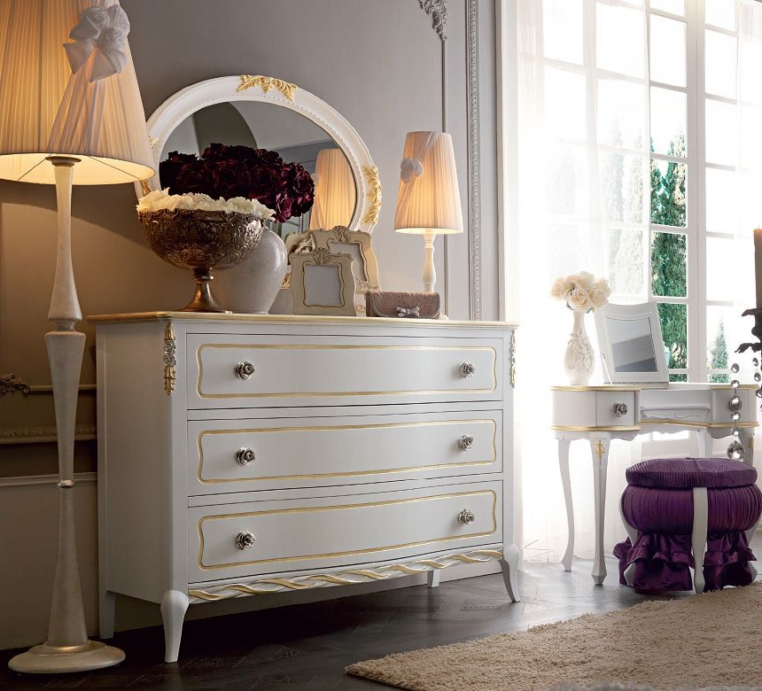 Bois commode avec trois tiroirs avec Blumotion. Commode avec un design classique, agrémenté de décorations faites à la main. Terminer " C10 Neige ".