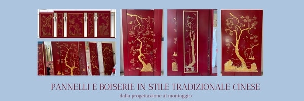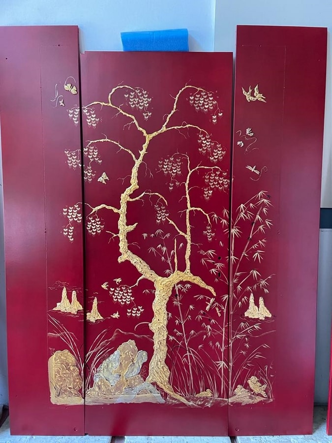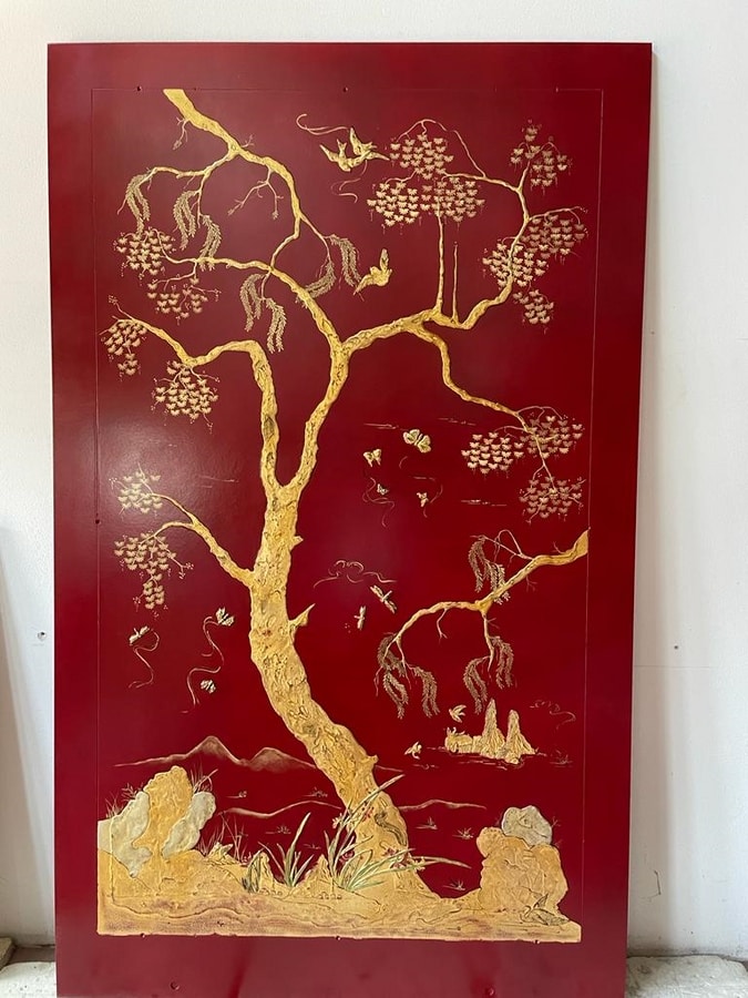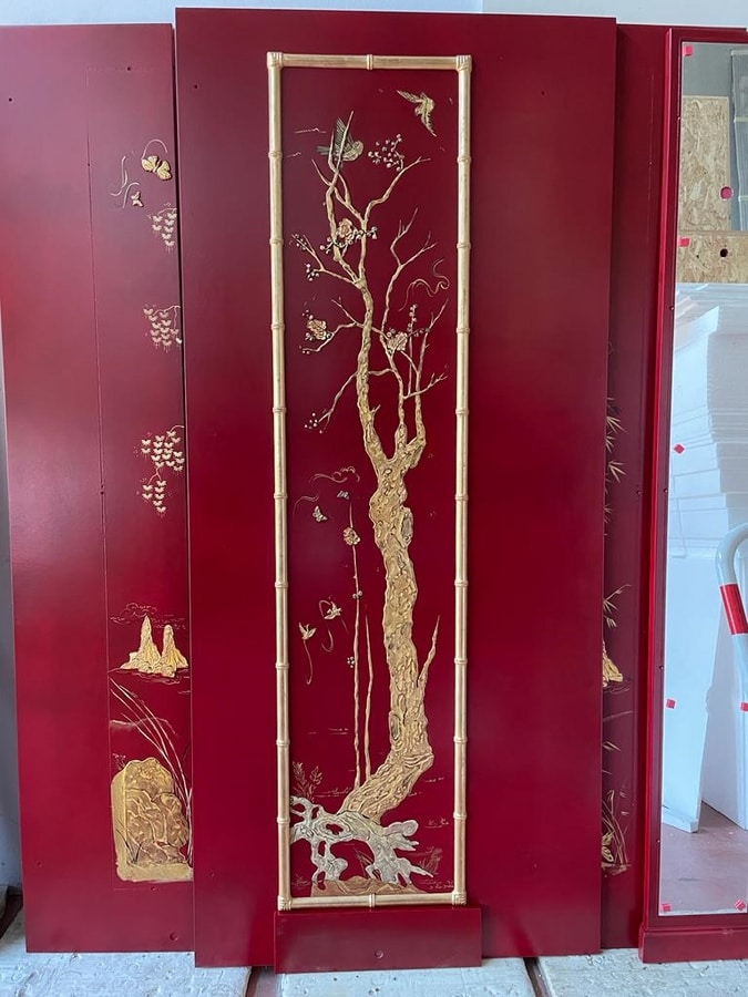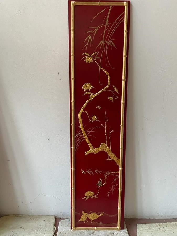 Panneaux en bois de différentes tailles, décorés à la main, en relief, avec des motifs de cineserie, dans le style traditionnel chinois. Feuille d'or/imitation or, laquée et protégée par un vernis. Insertion de cadres dans le modèle en bambou.