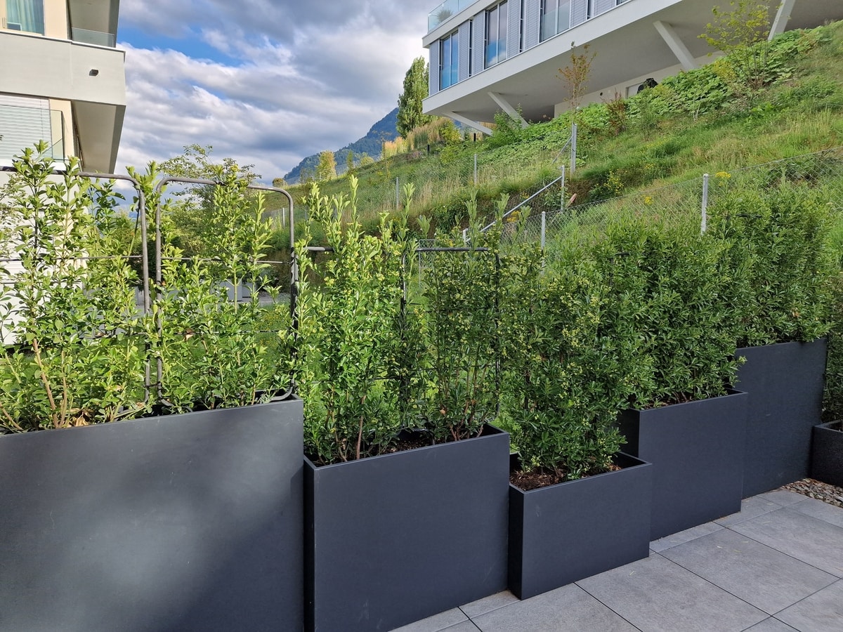 Jardinière en tôle galvanisée à chaud et thermolaquée pour usage extérieur. Disponible avec roues. Dimensions sur demande.
