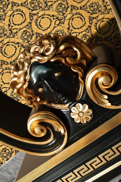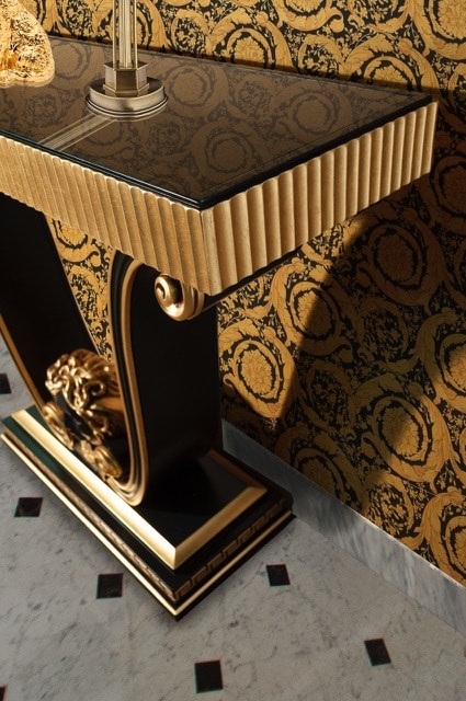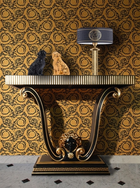 Console en bois, inspirée de la mythologie grecque, avec le visage Meduse finement sculpté, finition feuilles noires et dorées.