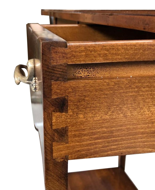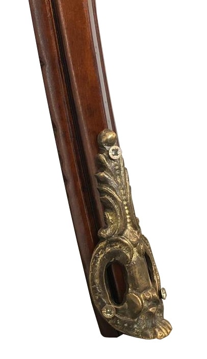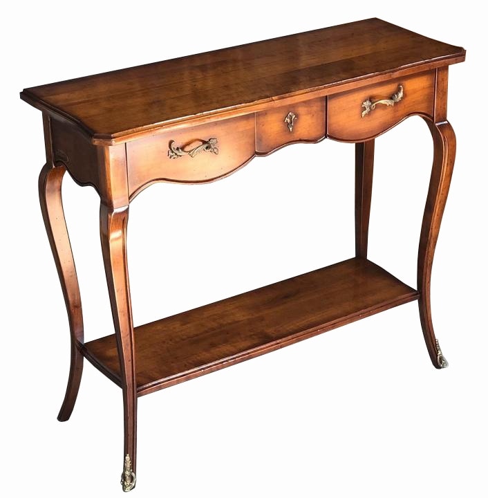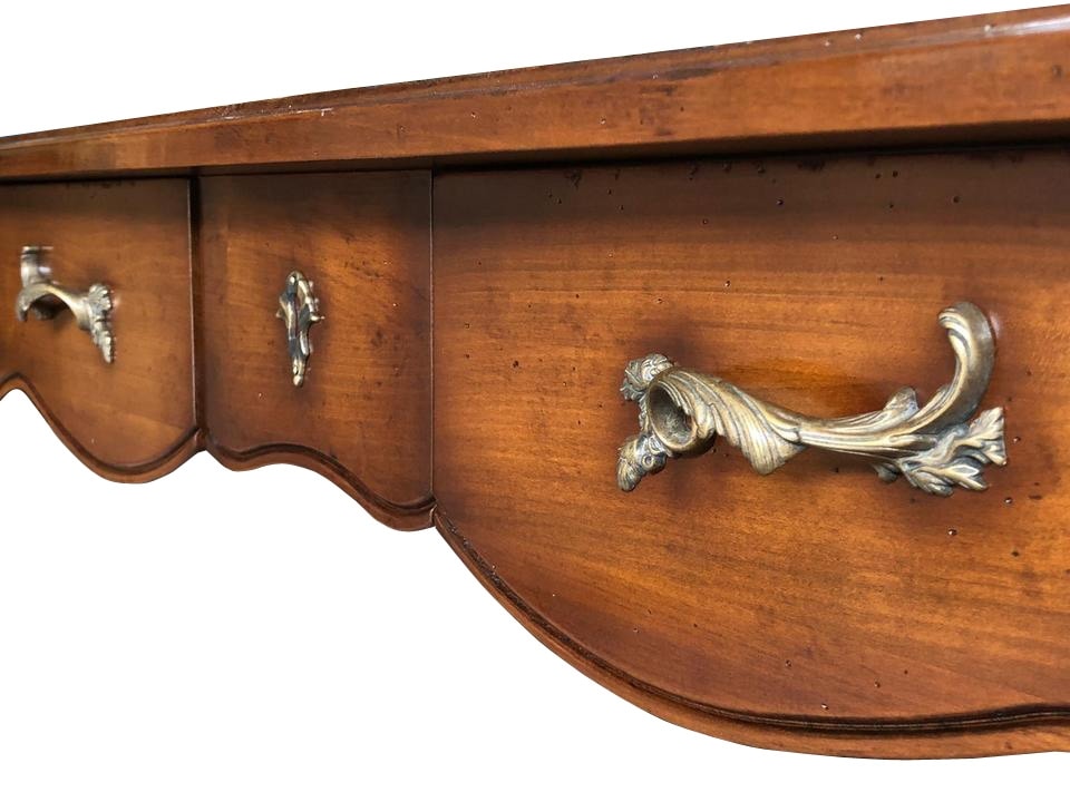Console Louis XV en merisier à deux tiroirs, pieds cabriole avec détails métalliques sur les pieds, tablier en forme et étagère inférieure en forme.