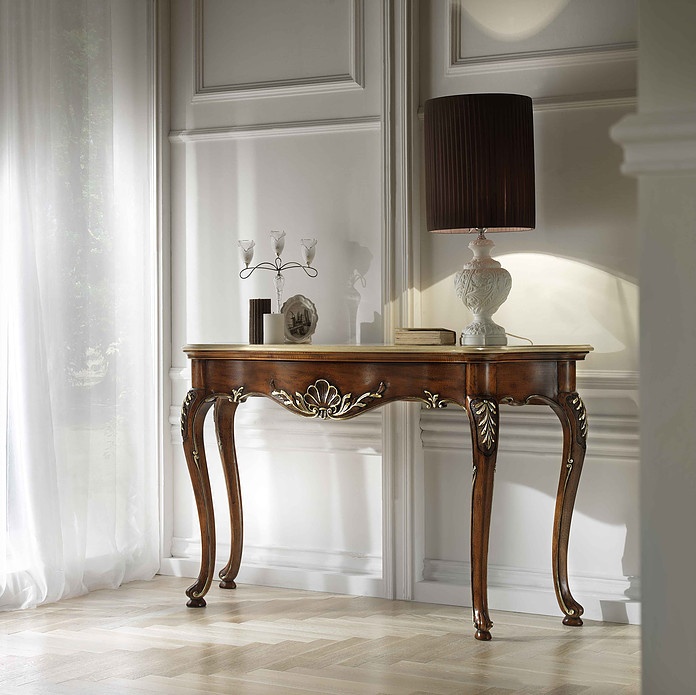 Demander prix Produits similairesConsole en noyer sculpté avec plateau en marbre Atlantis jaune, avec des détails dans la feuille d'or. version laquée disponible (L).