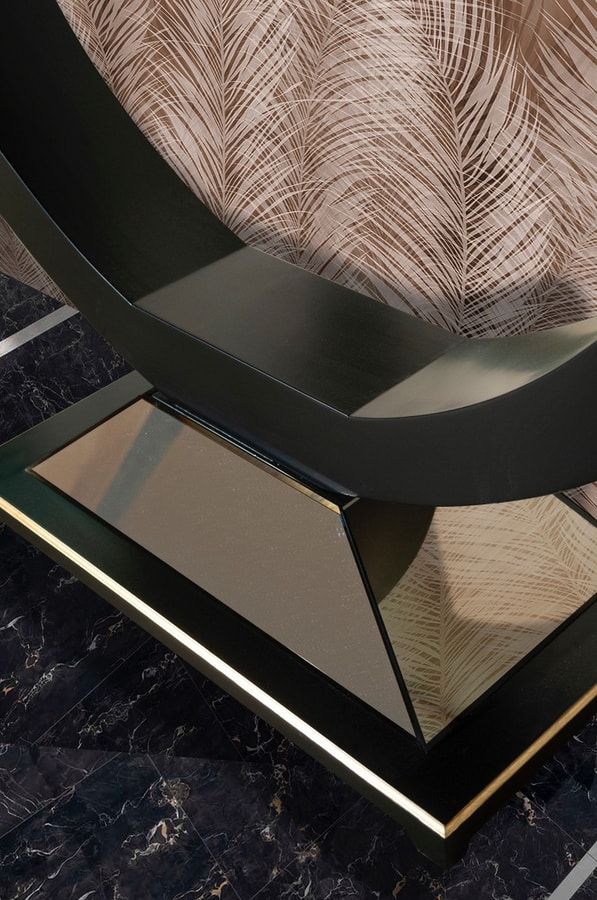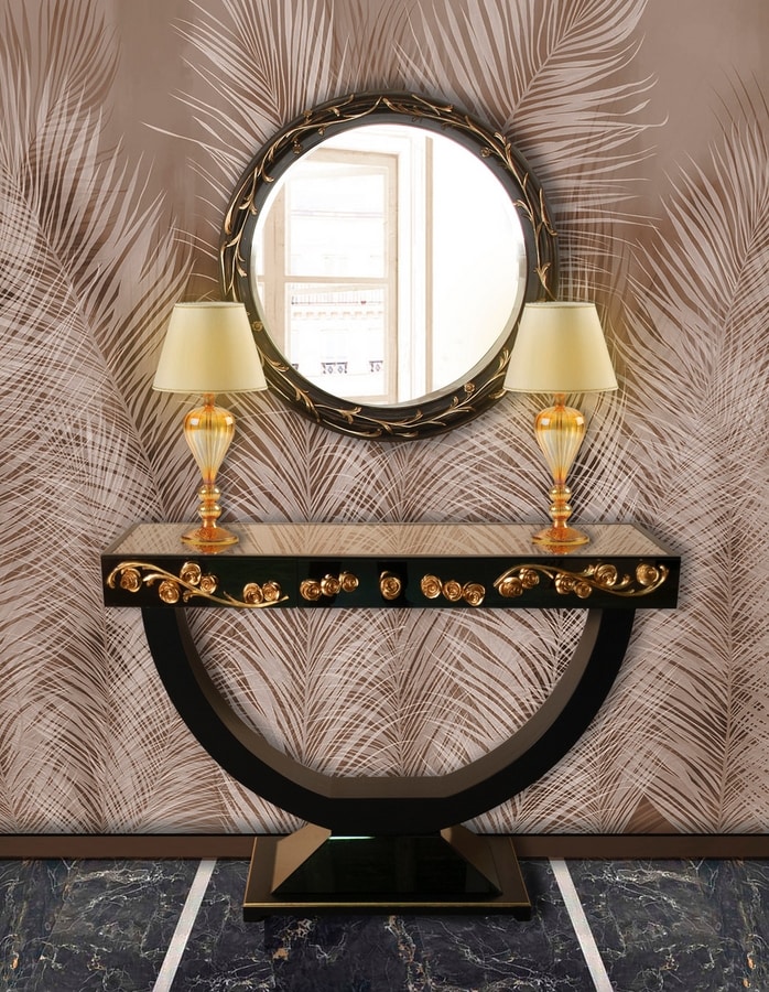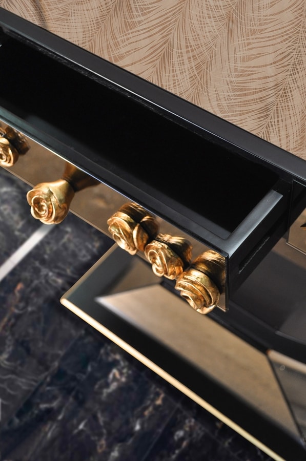 Elégante console en bois avec miroir en bronze, décoration artisanale en forme de fleur en relief à la feuille d'or, finition laquée noire, avec tiroirs.