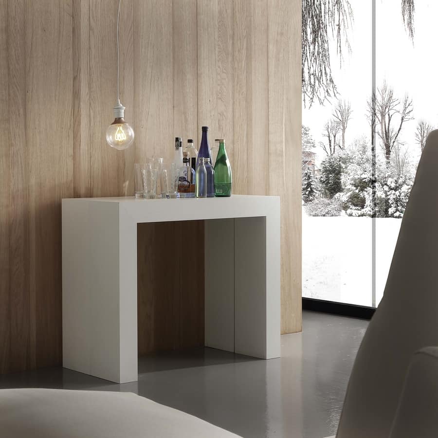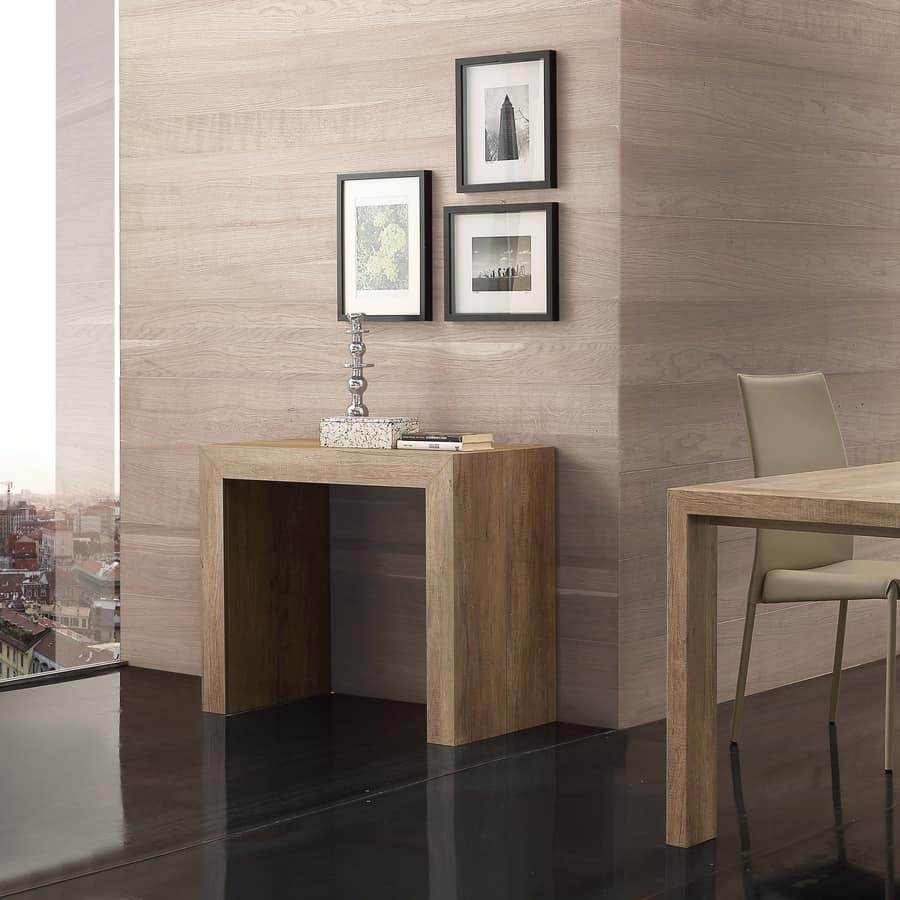 Table de console à économie d'espace dans la mélamine. Il peut être prolongé jusqu'à 295 cm. Pores ouverts blancs - Effet noueux Chêne - Effet en plâtre Chêne. Lorsque la table n'est pas utilisée, les extensions peuvent être placées à l'intérieur du chariot pratique (art 752 TRUCK). Support intérieur intégré jambe blanche.