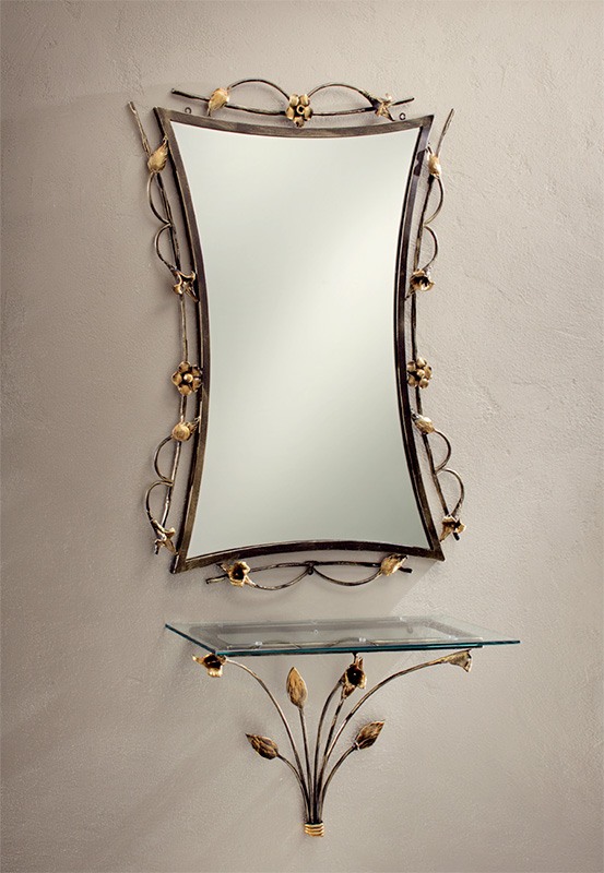 Console avec structure en fer forgé débourrer et supérieure en verre. Console murale appropriée pour l'ameublement d'entrée.