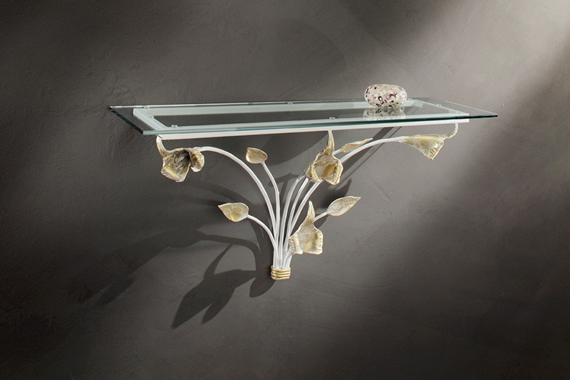 Console avec structure en fer forgé débourrer et supérieure en verre. Console murale appropriée pour l'ameublement d'entrée.