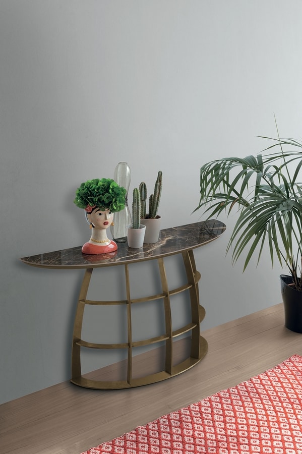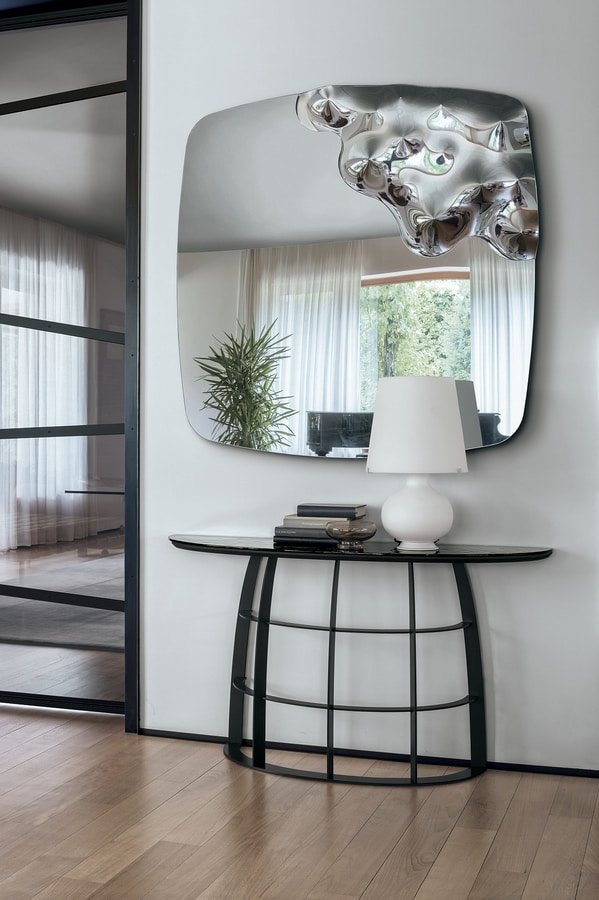 Console avec base en fer laqué et plateau en céramique ou verre ondulé.