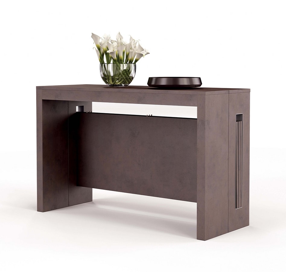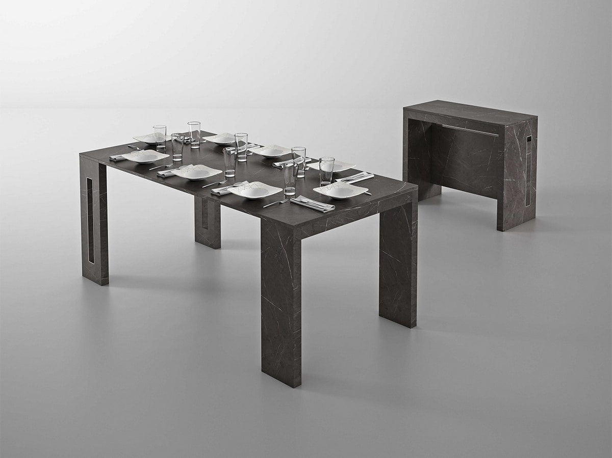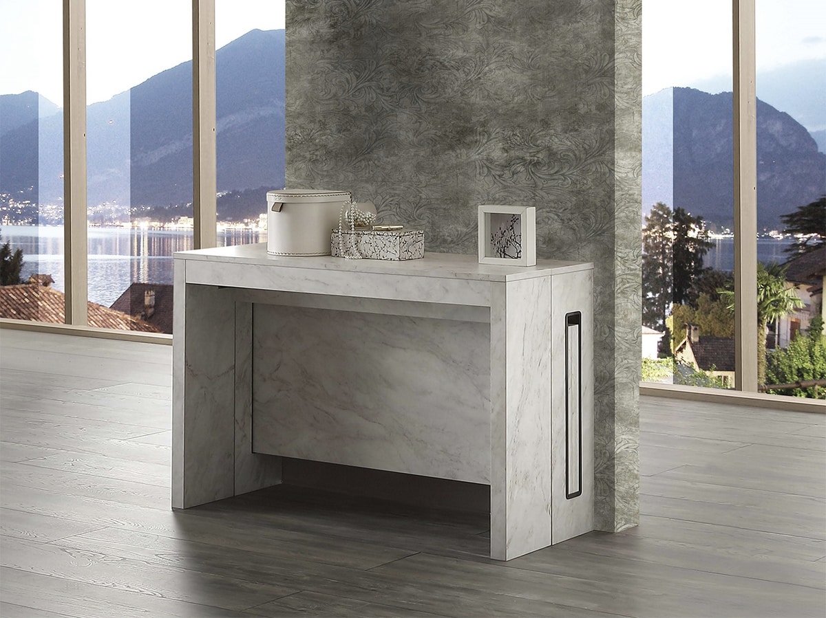 Son mécanisme interne pratique assure un processus d'extension en douceur, transformant la console en une table accueillante capable d'accueillir confortablement jusqu'à 6 convives. Chaque détail, du choix du bois stratifié au marbre teinté, évoque un sentiment de raffinement et de style, créant une atmosphère accueillante et contemporaine.