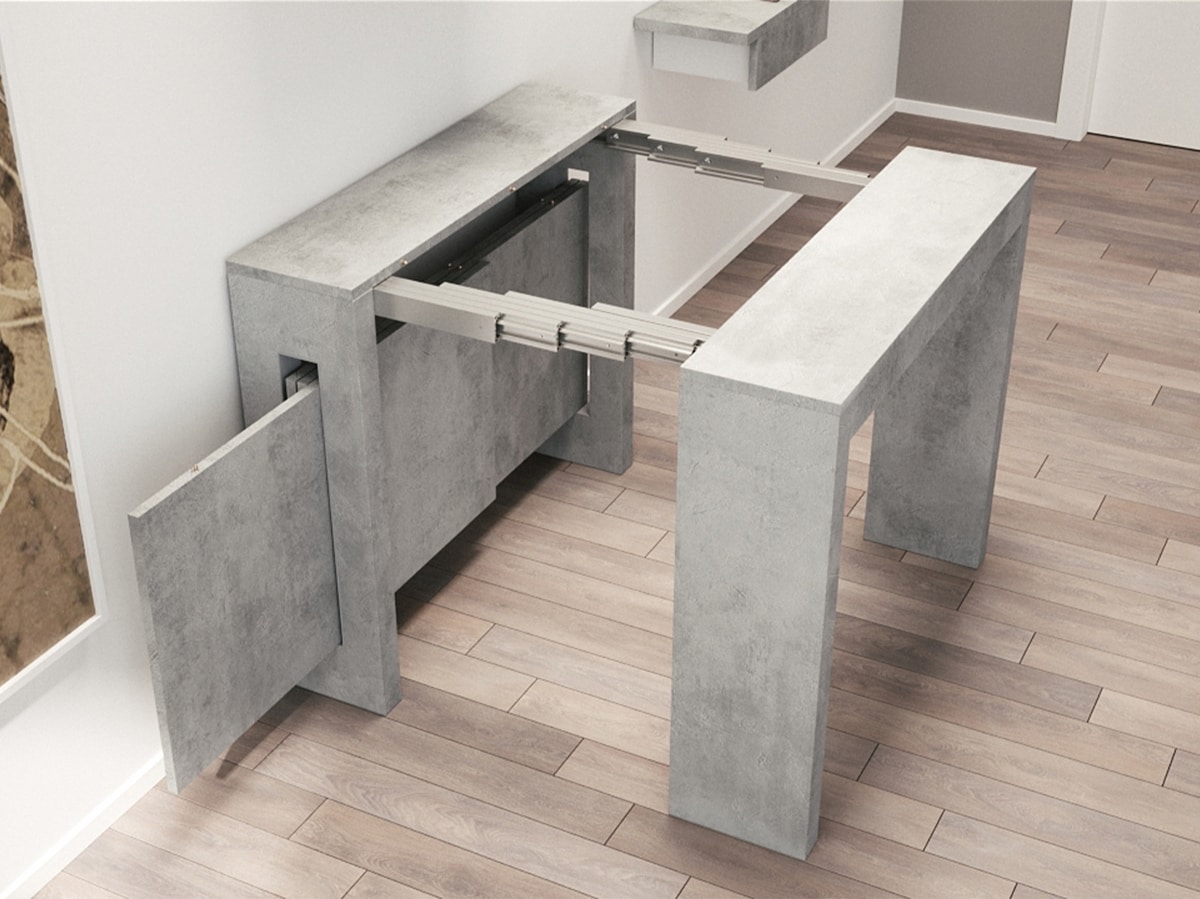 Lorsqu'elles ne sont pas utilisées, les extensions peuvent être gracieusement rangées dans les pieds, disparaissant discrètement dans la structure. La console se transforme et devient un élément de design qui s'adapte à l'espace environnant.