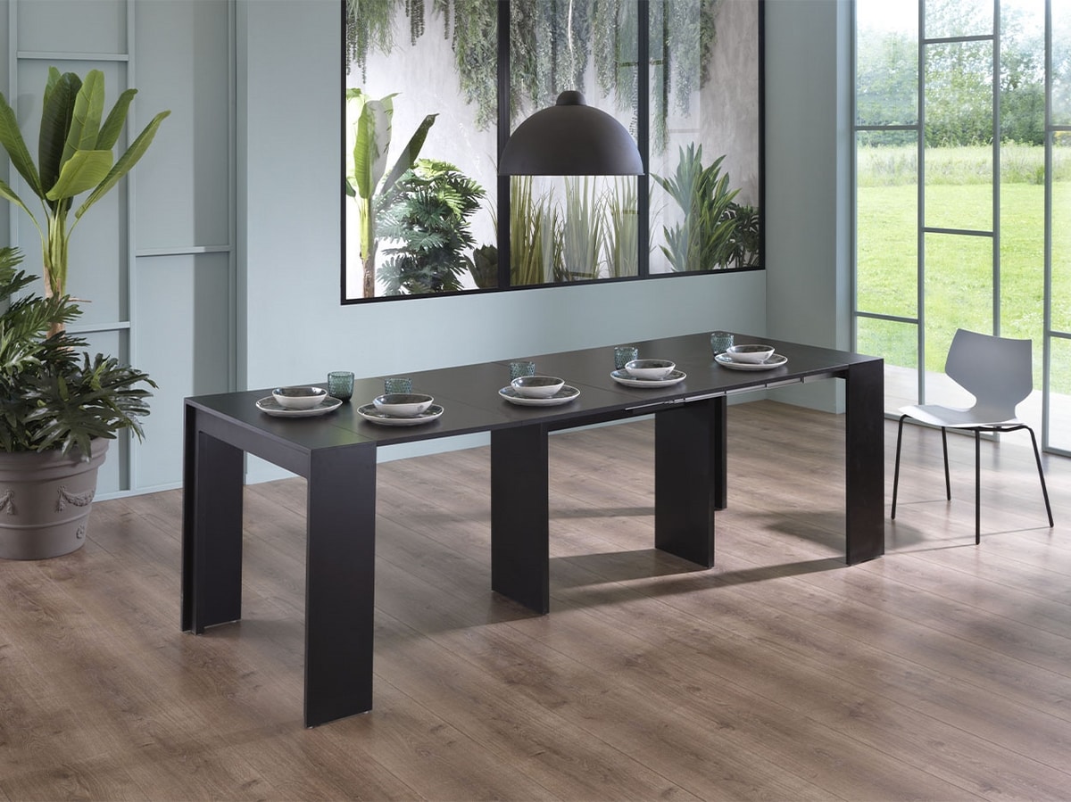 Demander prix Produits similairesLa console rectangulaire extensible, entièrement réalisée en MDF laqué, est disponible en versions Blanc Mat, Gris Mat, Noir Mat et Taupe Mat. Il comporte 5 rallonges de 52 cm chacune, rangées dans un conteneur dédié, et un pied central inclinable pour la configuration table ouverte.