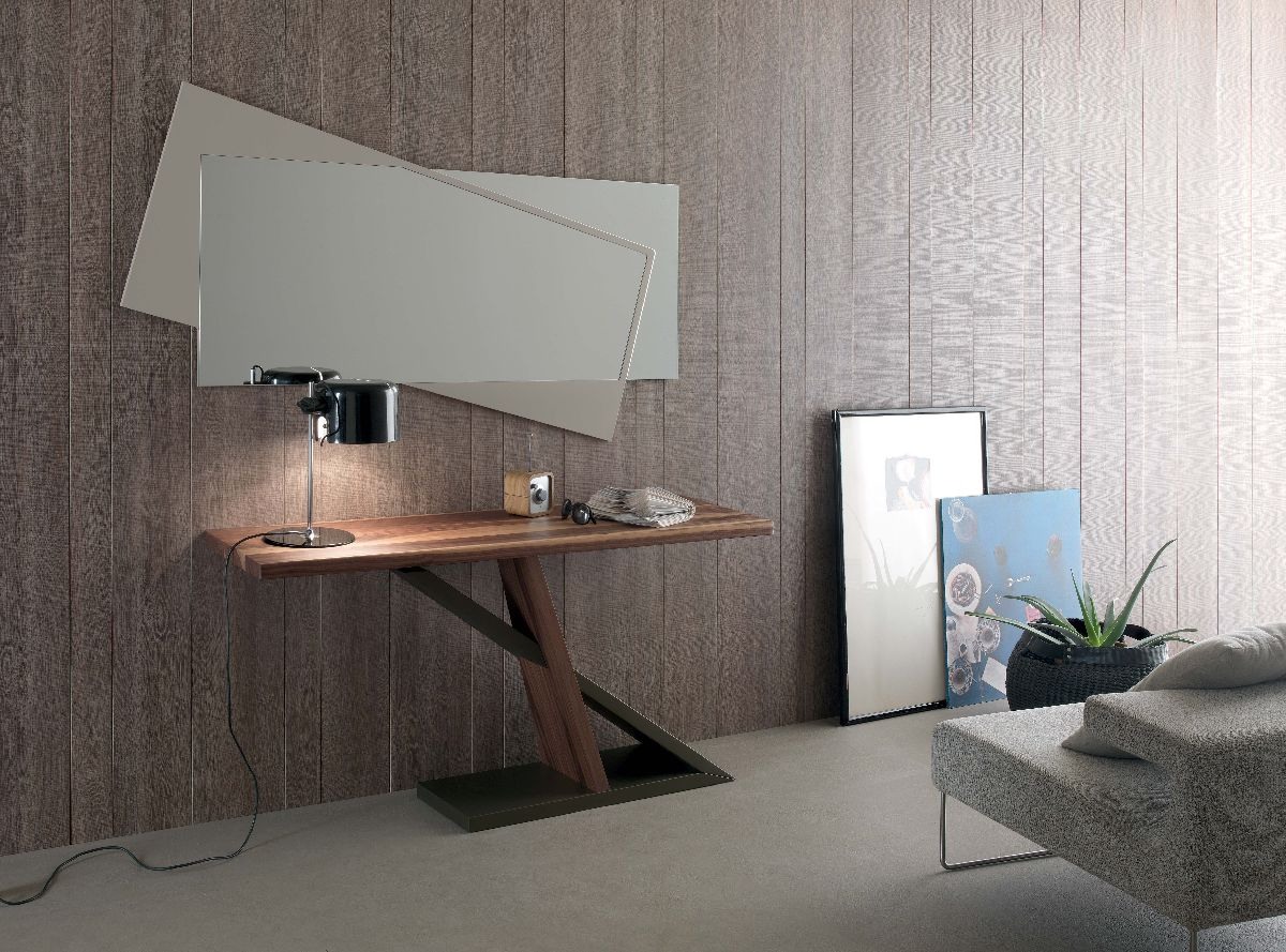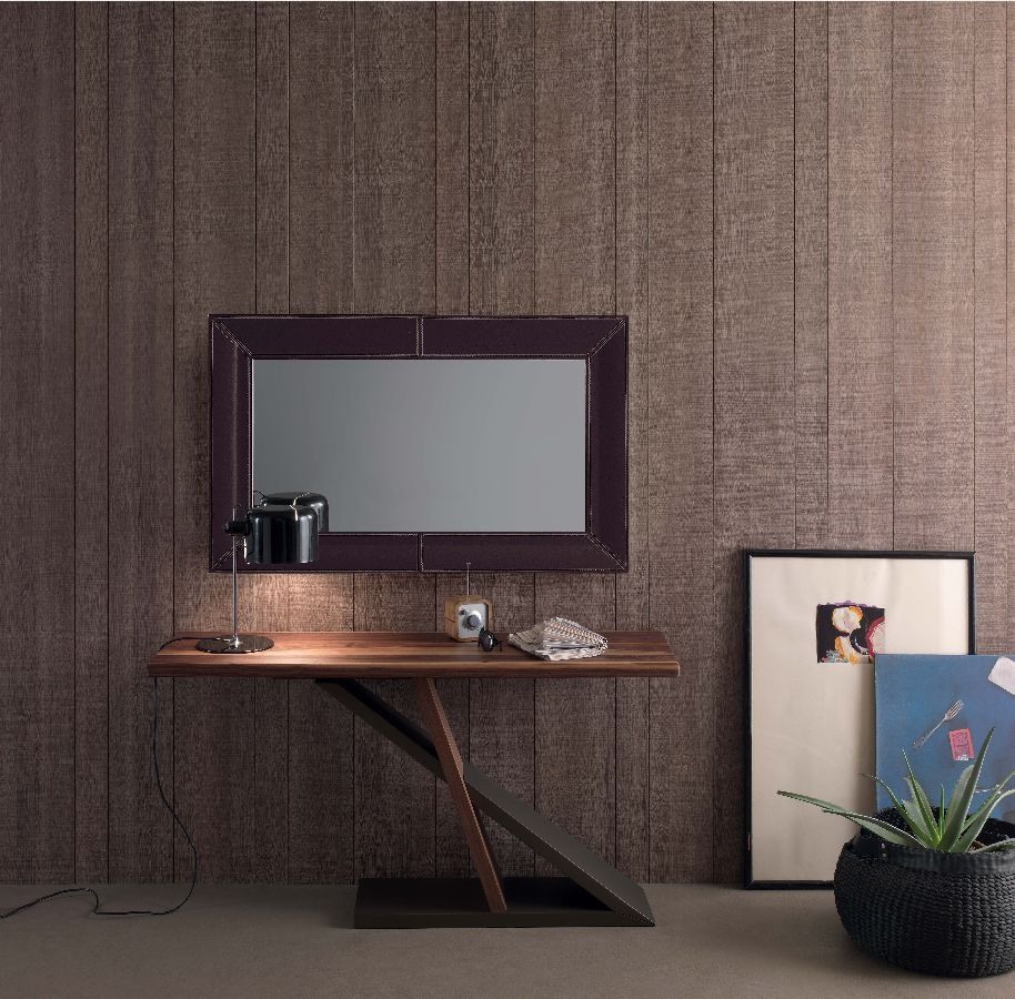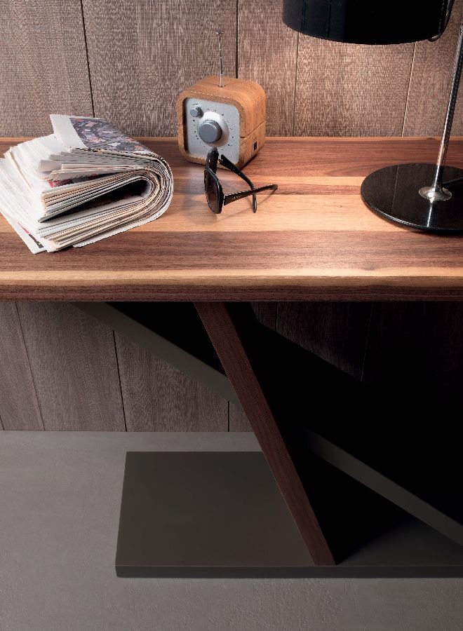 Console en bois laqué bronze avec insertions en bois plaque noyer canaletto. Plateau en bois plaque noyer canaletto, épaiss.cm 2.5.