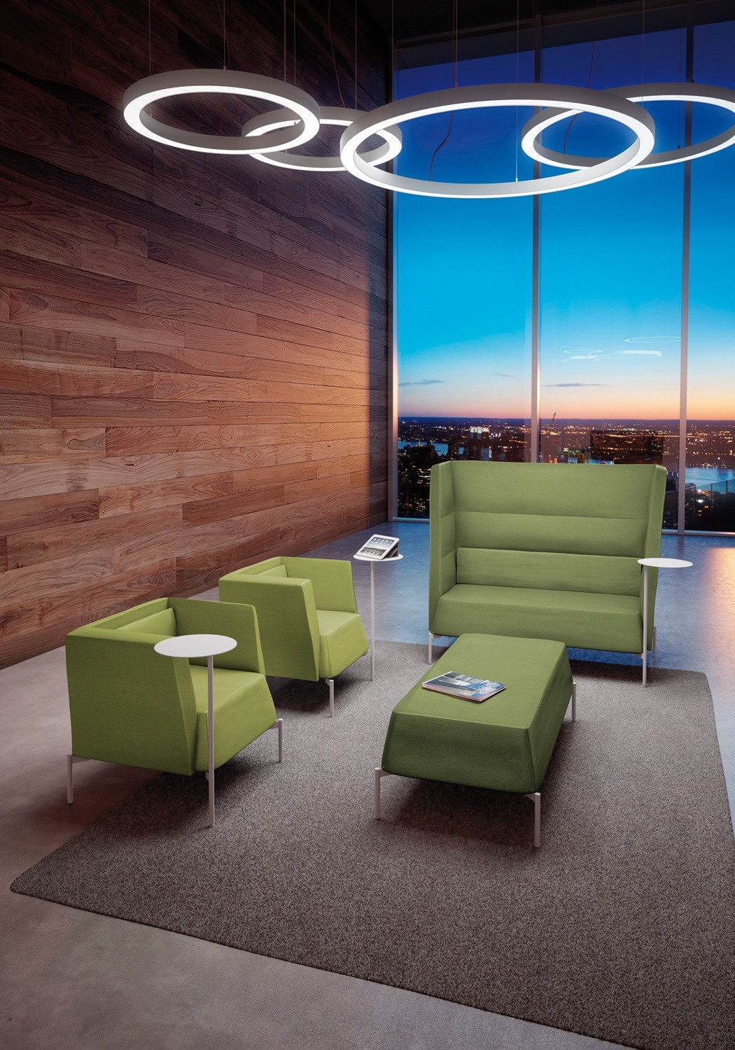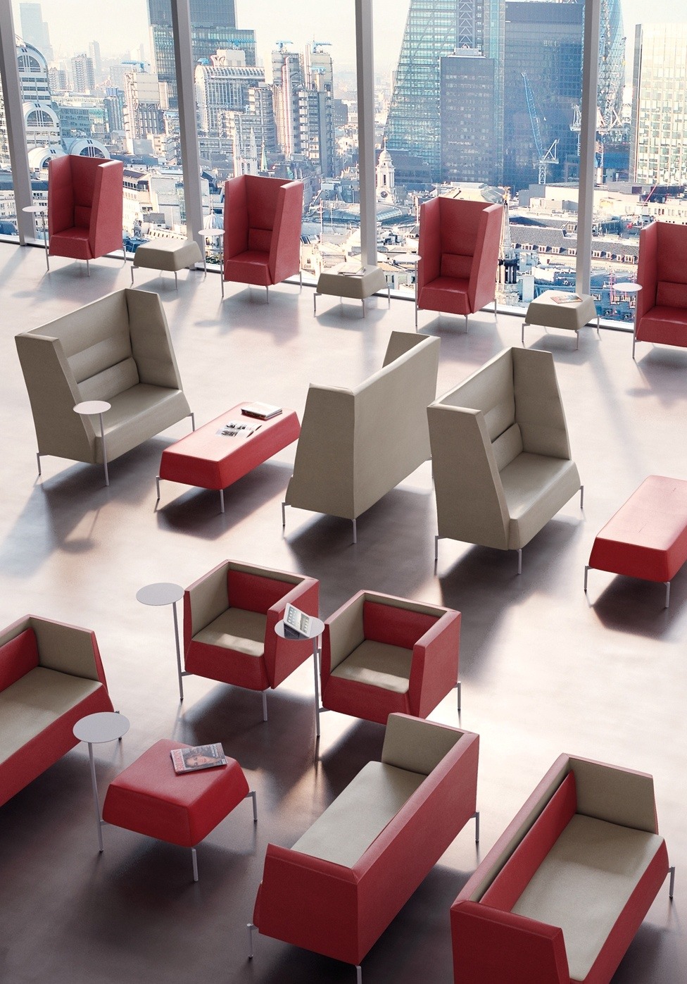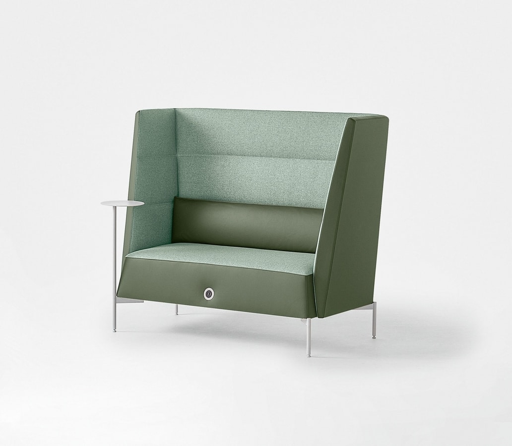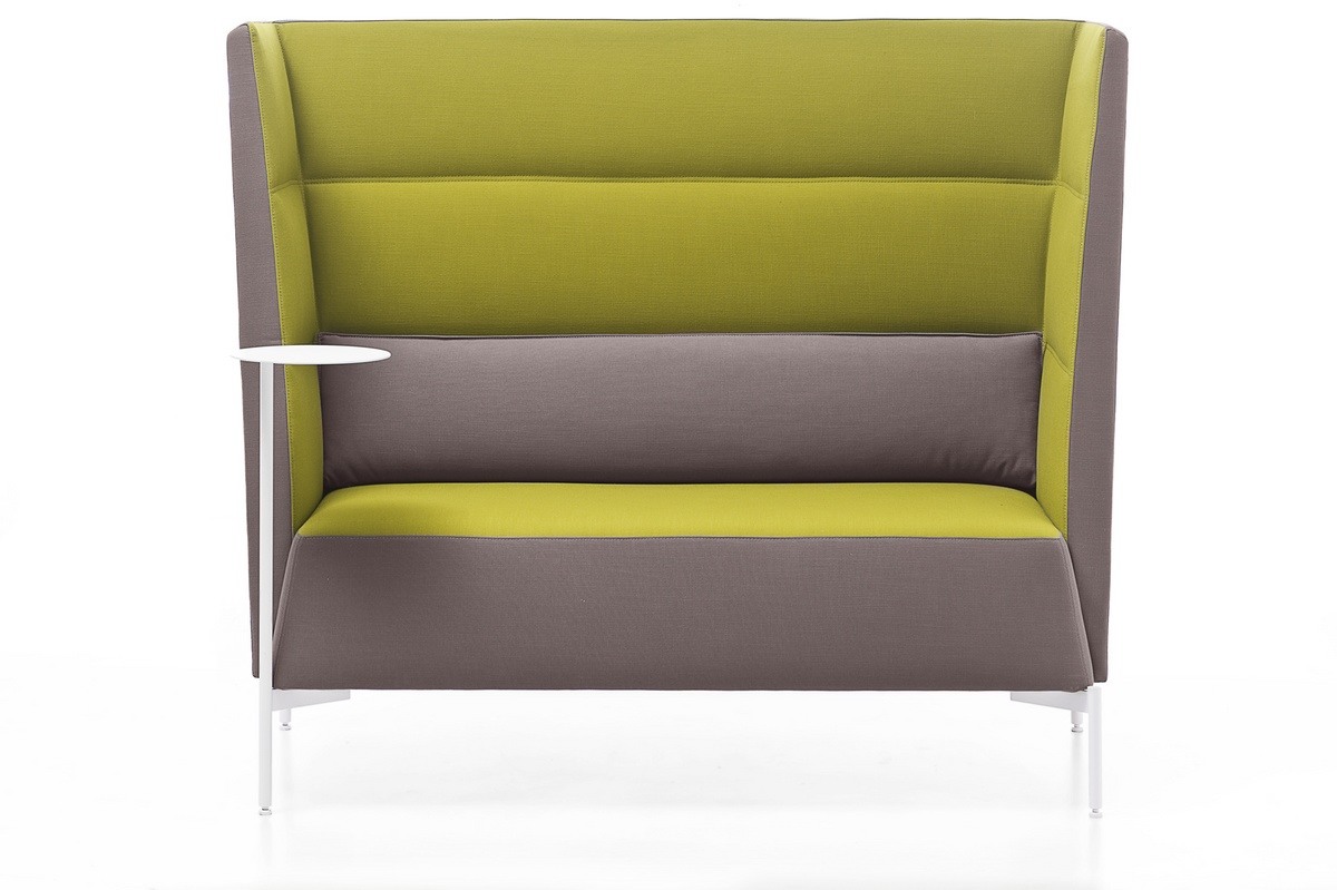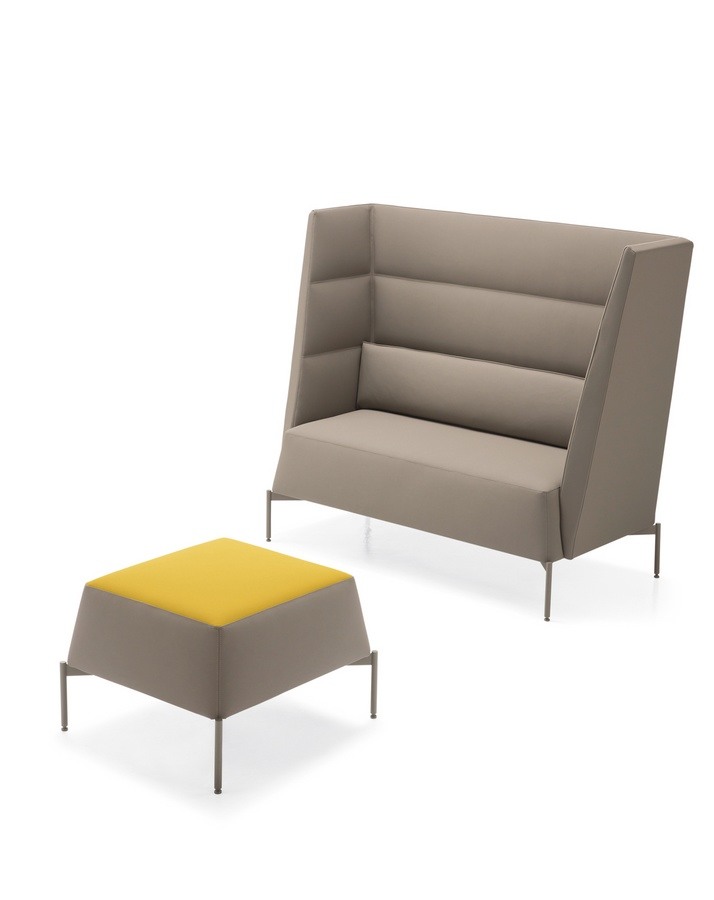 Canapé à dossier haut. Gamme de fauteuils et canapés sur pieds en acier verni et avec revêtements unicouleurs et bi-couleurs. Les versions à moyen et haut dossier, en plus de créer des zones de réunion/de travail, offrent un excellent confort acoustique.