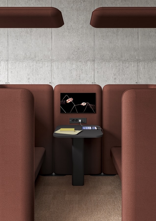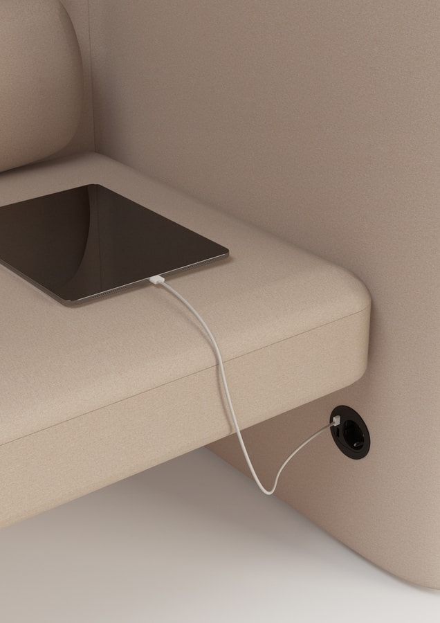 Avec une structure en bois de 50 mm, rembourrage en polyuréthane de 25 mm et un revêtement en tissu non déhoussable, Kumo Pod est disponible en différentes variantes chromatiques et structurelles, parfait pour les bureaux, les salles d’attente et les espaces résidentiels. Garantit polyvalence, praticité et élégance, en s’adaptant aux nouveaux modèles de travail et de vie, grâce aussi à la possibilité d’intégrer des compositions électriques.