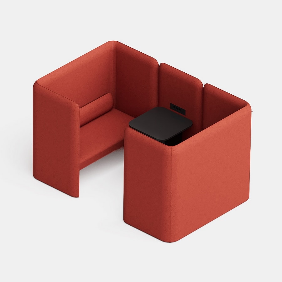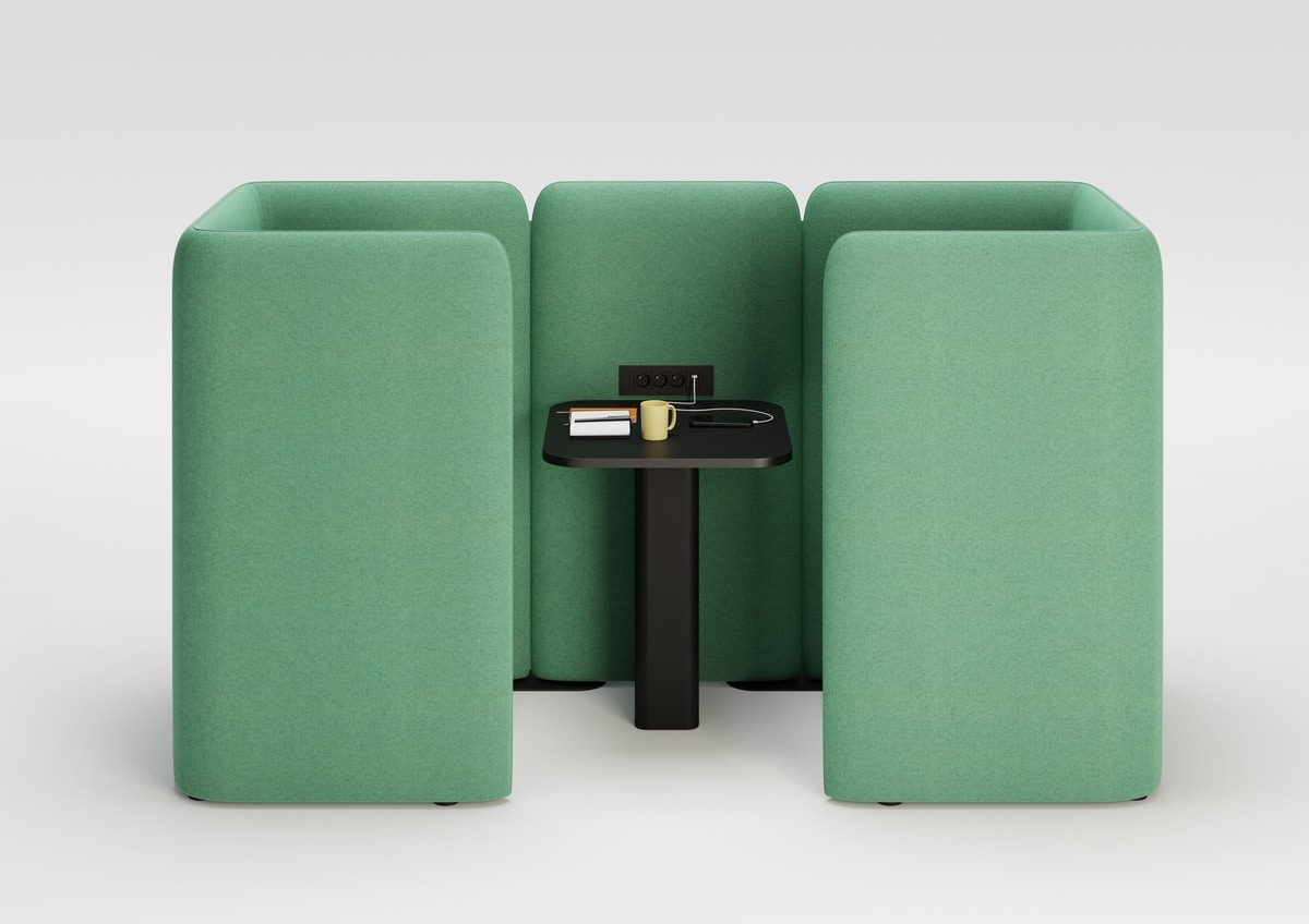 Kumo Pod 4.1 est le set canapé/fauteuil avec panneau acoustique et – sur demande – table avec colonne décentralisée, idéal pour les espaces modernes et flexibles.