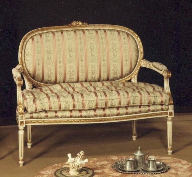 Canapé 2 places, avec cadre en bois massif sculpté à la main avec décorations en feuilles d'or, fait de style classique de luxe, idéal pour les salons.
