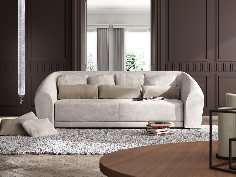 Canapé avec forme arrondie avec pieds en bois et coussins moelleux pour le dos. Disponible en cm largeur 250 et 300, et en tissu ou cuir.