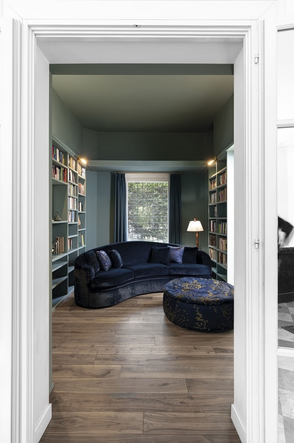 L'espace de vie est plongé dans les tons de bleu Anémone. La palette élégante colore le salon avec le canapé recouvert de douce fourrure bleue.