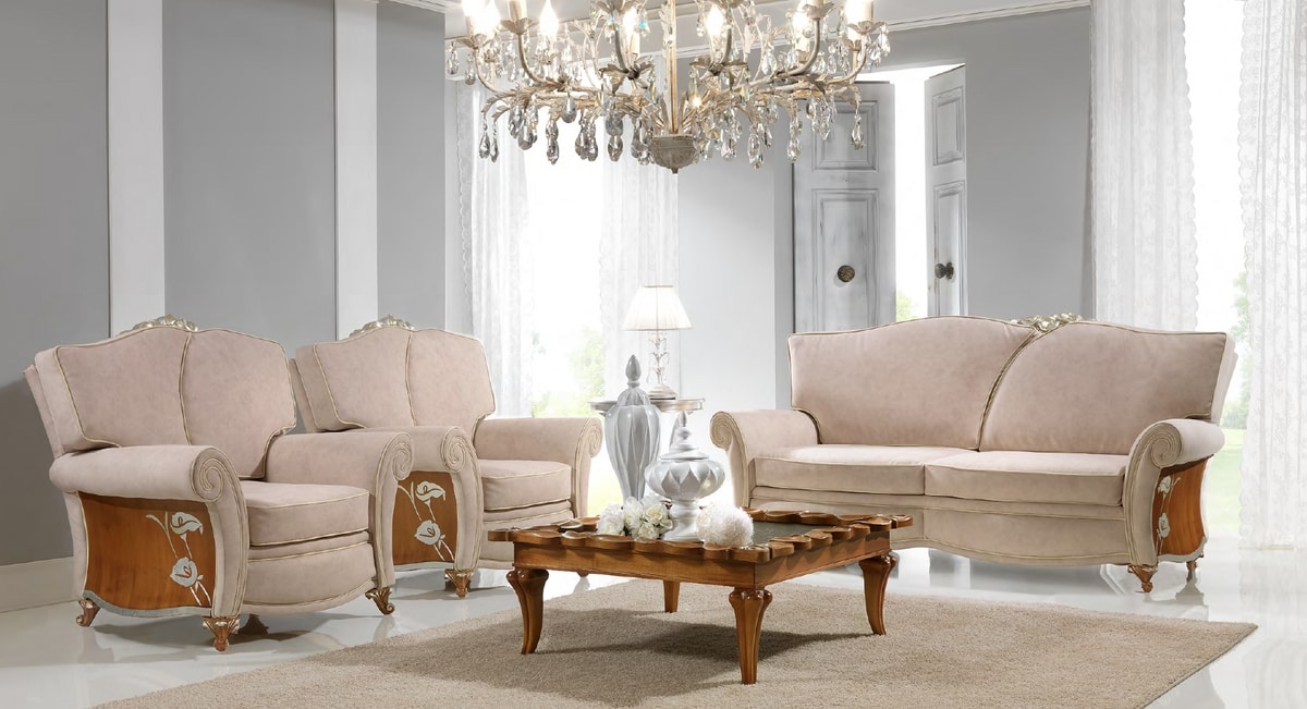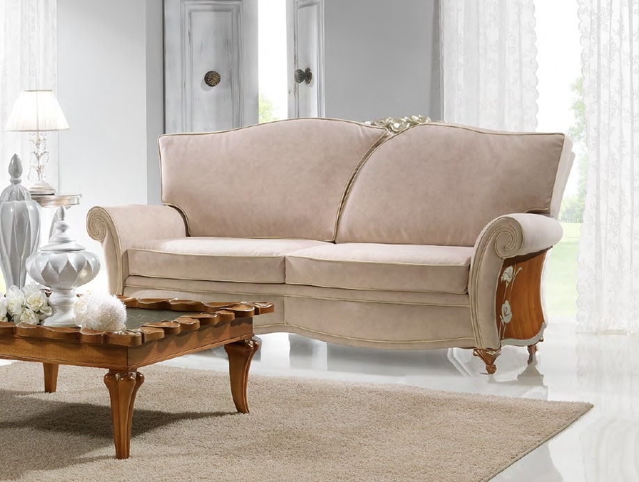 Demander prix Produits similairesCanapé de design classique, avec un rembourrage en écos-cuir. Pieds et côtés en bois en noyer, avec des décorations florales argentées.