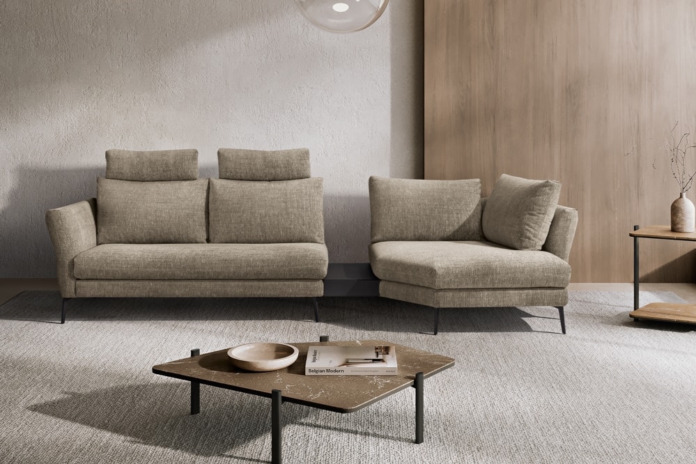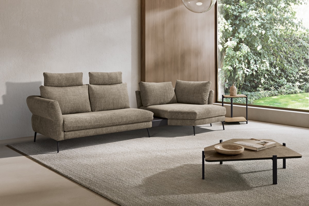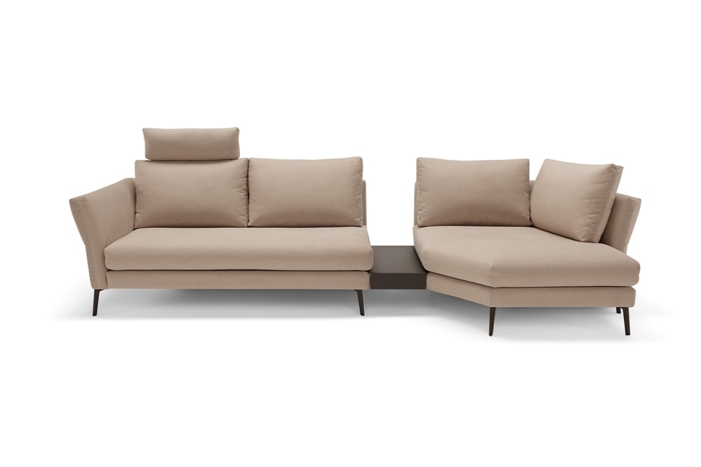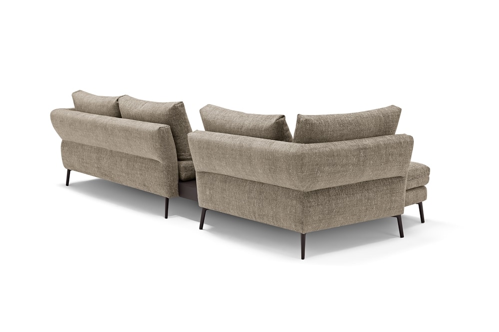 Demander prix Produits similairesConçu pour meubler le living avec versatilité, Vibe est un grand canapé 3places auquel on a associé une peninsule à base trapezoidale avec des dossiers. Ces derniers définissent deux places assises supplémentaires, multipliant ainsi le confort et la convivialité du canapé. Particulièrement raffiné dans son design et realisé pour être apprecié comme pièce maîtresse, Vibe se caractérise par le dossier sur lequel des coutures continues dessinent deux bandes horizontales superposées. La partie supérieure, grâce à un jeu d’astuce de rembourrage, définit un profil qui déborde légèrement. Pour plus de confort et de fonctionnalité, il est possible d’ajouter des appuis-tête aux sièges et d’intégrer une tablette-étagère en métal disponible en deux finitions différentes, comme élément de liaison entre les dexu modules.