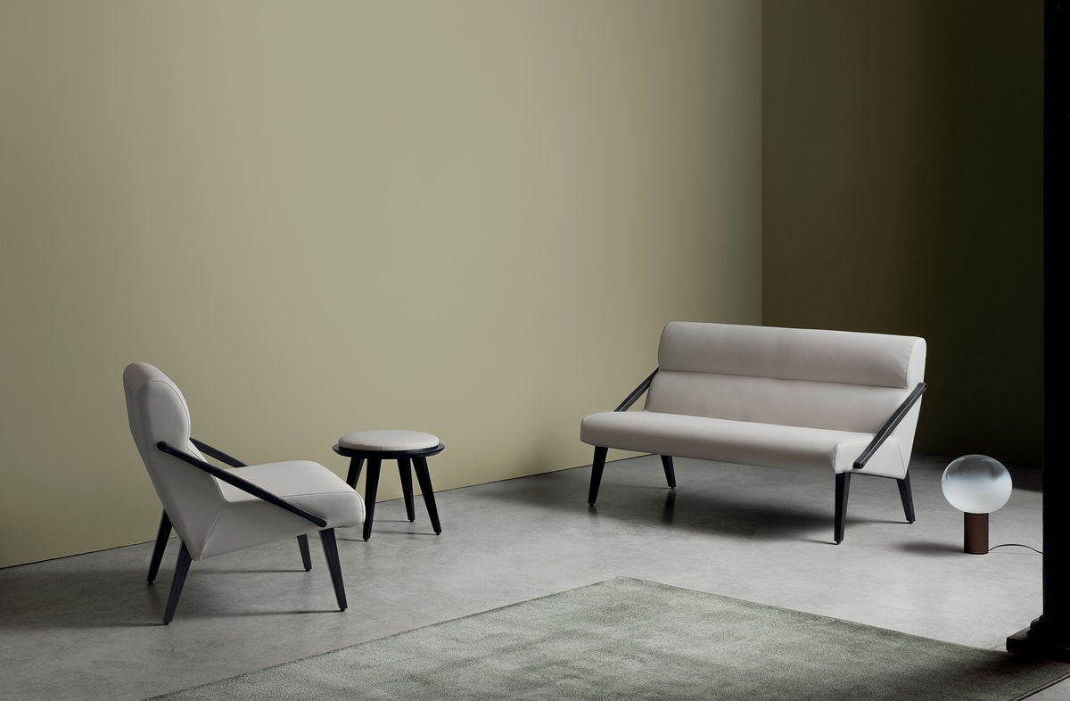 La collection de meubles rembourrées d'Atsa, avec un fauteuil, un canapé-salon et un tabouret, rend hommage aux années 1950. Ses élégants jambes en bois soutiennent une coquille rembourrée sinueuse, offrant une relaxation immédiate à quiconque s'y installe. La collection comprend deux versions d'ATTESA: 01 avec un accoudoir en bois qui relie le dos au siège transversalement, et 02 avec un accoudoir en L classique. Les deux modèles sont idéaux pour orner les espaces avec un flair contemporain et distinctif raffiné.