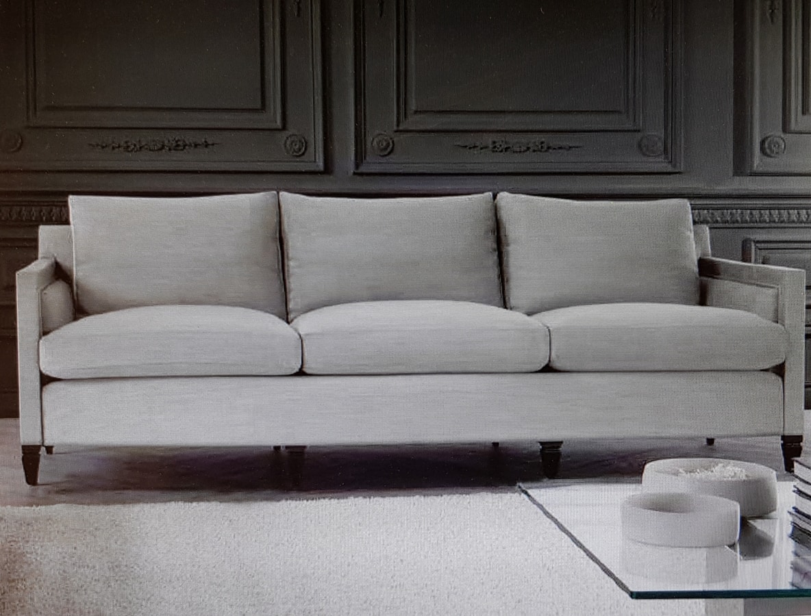 Structure de canapé 3 places en bois massif, tissu brut, coussins amovibles avec duvet d'oie.