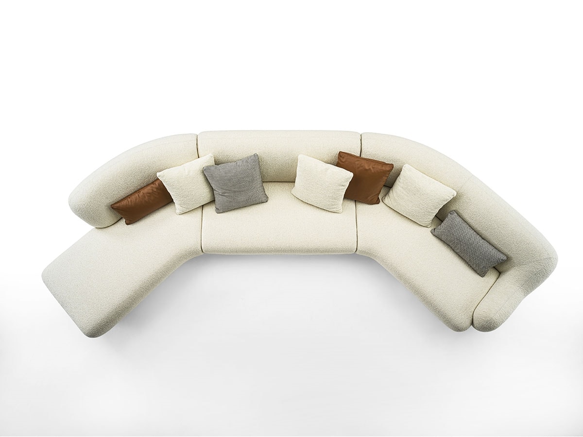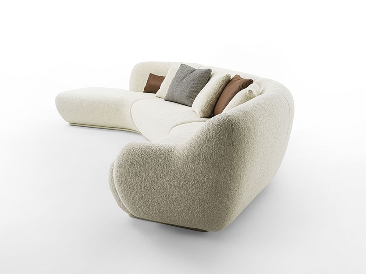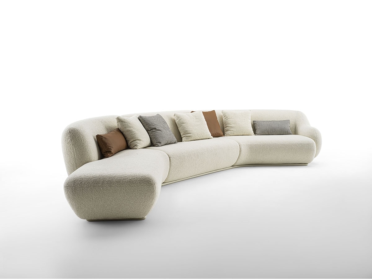 Canapé modulable caractérisé par la douceur de ses volumes. Il peut également être placé au centre de la pièce grâce à son dossier incurvé. Base en bois en finition laquée, disponible en différentes couleurs.