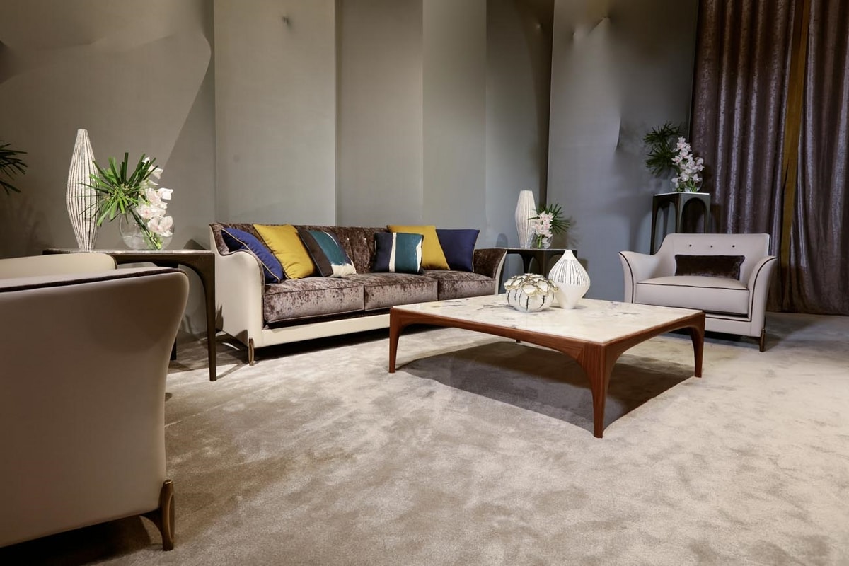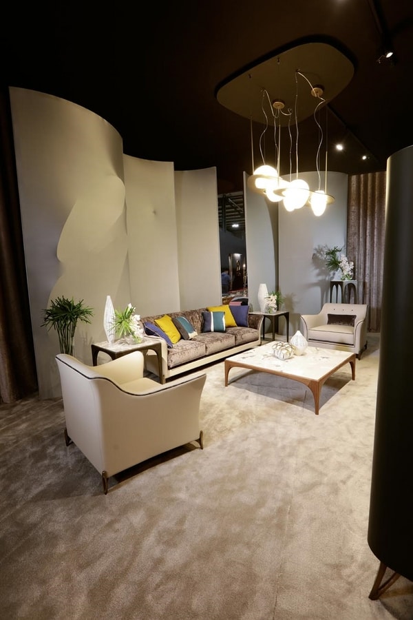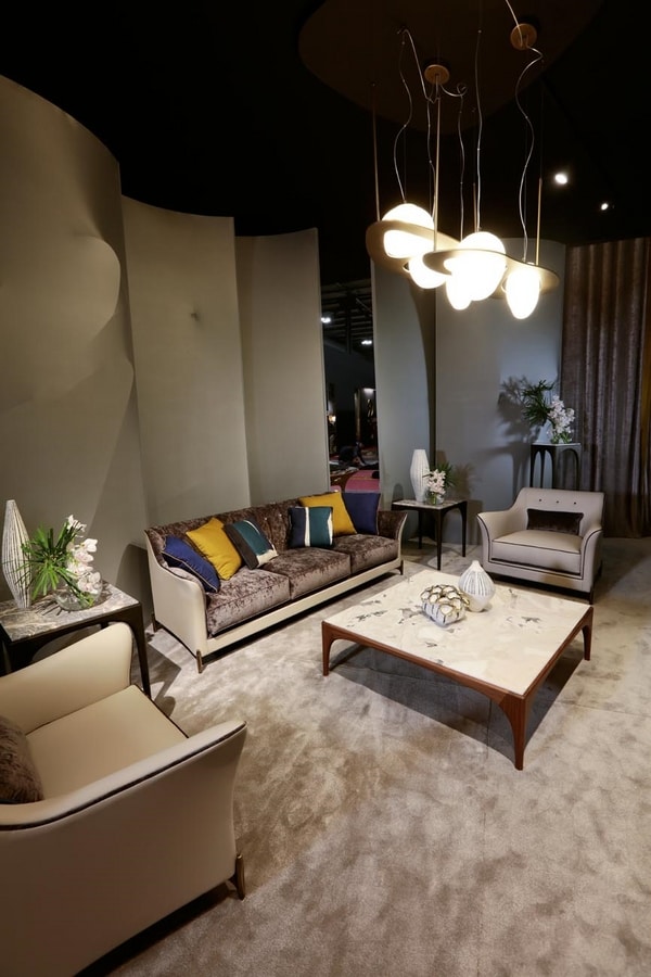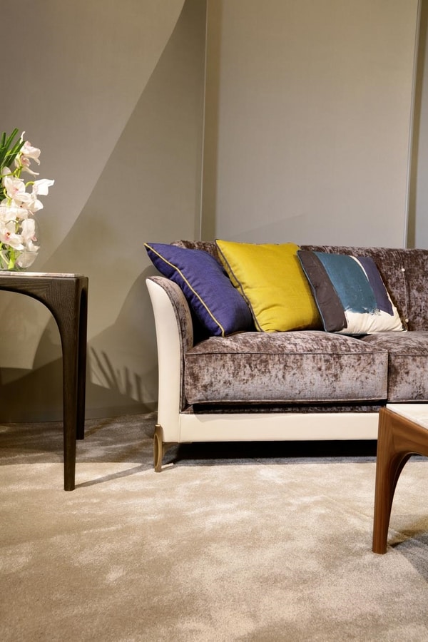 Canapé contemporain à 3 places. Canapé 3 places avec revêtement intérieur en tissu. La structure est recouverte de cuir avec des profils en tissu qui contrastent avec la couleur claire. Il est soutenu par des pieds sculpturaux en laiton fini bronze mat. La nuance du tissu sélectionné vous permet de jouer avec les couleurs vives pour les coussins décoratifs. Avec le fauteuil et les tables, il forme un salon accueillant et design grâce aux lignes simples mais enrichi par l'utilisation de matériaux précieux.