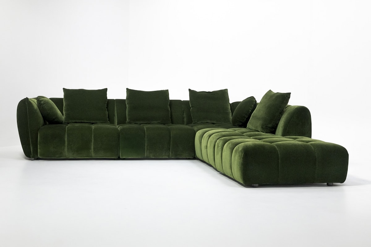Les surfaces matelassées créent une texture tridimensionnelle qui rehausse la lumière, tandis que les larges sièges et les coussins amples assurent un confort au quotidien. Un équilibre parfait entre design, modularité et détente.