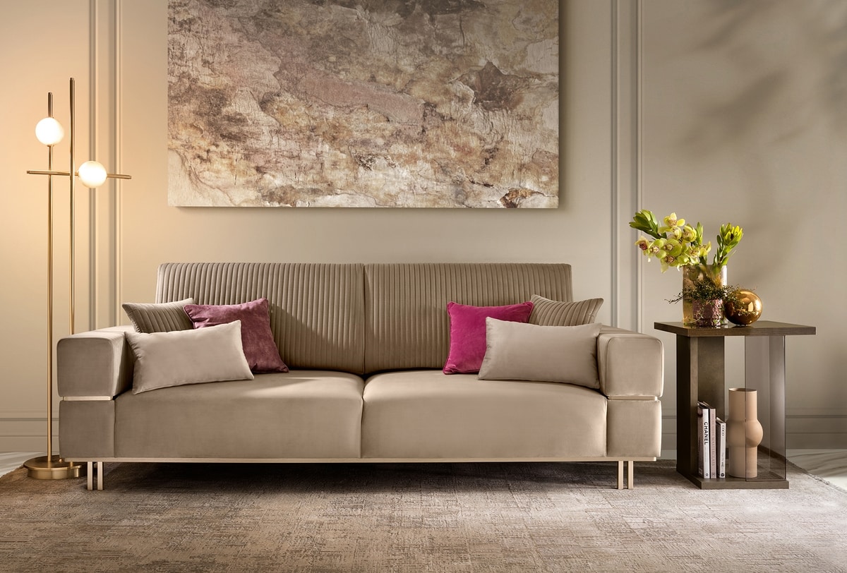 Demander prix Produits similairesLes canapés du salon Fiamma représentent une zone de confort contemporaine, définie par des volumes doux mais géométriques conçus pour allier détente et esthétique haut de gamme. Les pieds en or satiné de couleur champagne et les profils métalliques des accoudoirs font écho aux finitions de l'espace de vie, créant un fil-rouge visuel entre les espaces qui enrichit les projets de décoration intérieure les plus exigeants. La possibilité de choisir le revêtement parmi le large échantillon de tissu Adora permet des configurations hautement personnalisées, transformant chaque canapé en une pièce distinctive et sur mesure.