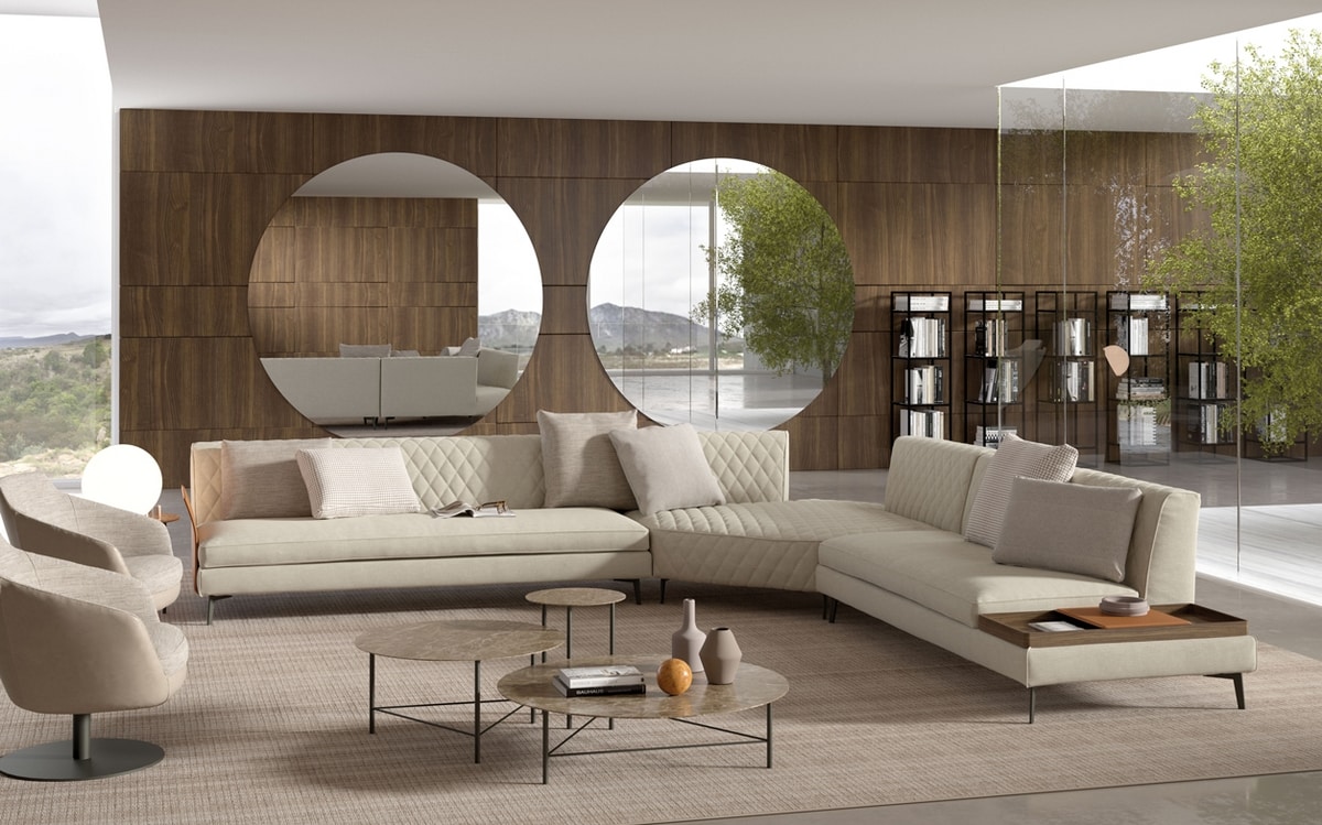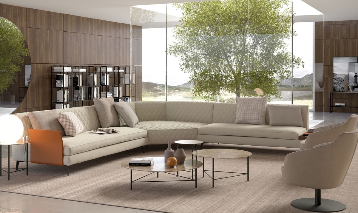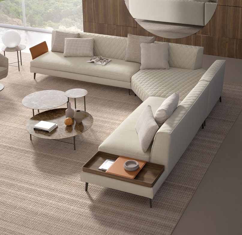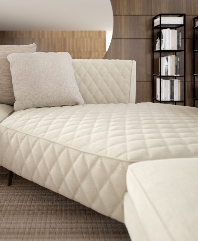 Thea est une collection de meubles rembourrés modulaires avec une ligne moderne et sophistiquée. Son design épuré et linéaire est enrichi par un ravissant matelassage rhomboïdal qui orne les dossiers. Le même matelassage trouve également sa place dans certains éléments d'assise qui, combinés à des éléments traditionnels, rendent l'ensemble de la collection originale et insolite. Ses assises profondes jointes et un ensemble de coussins décoratifs adaptés en font un canapé particulièrement confortable.