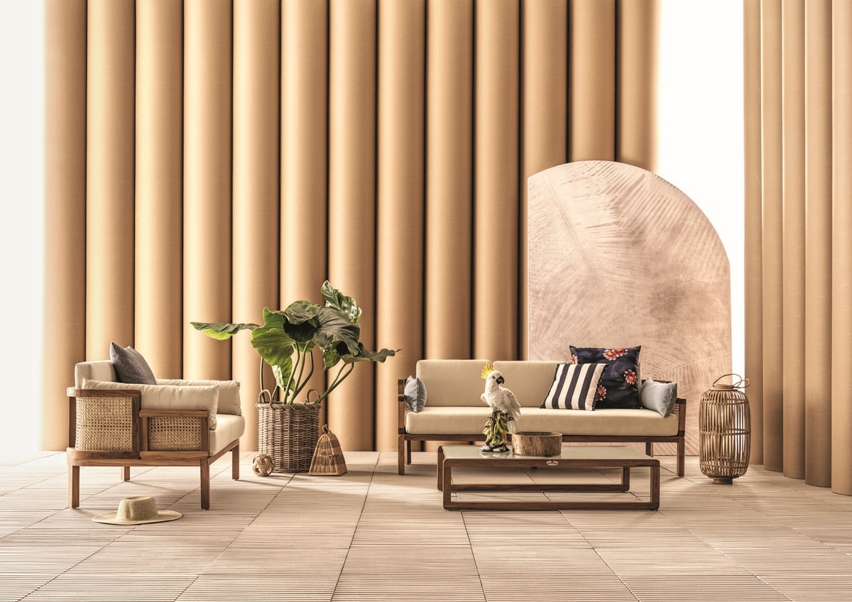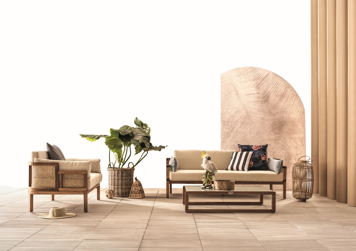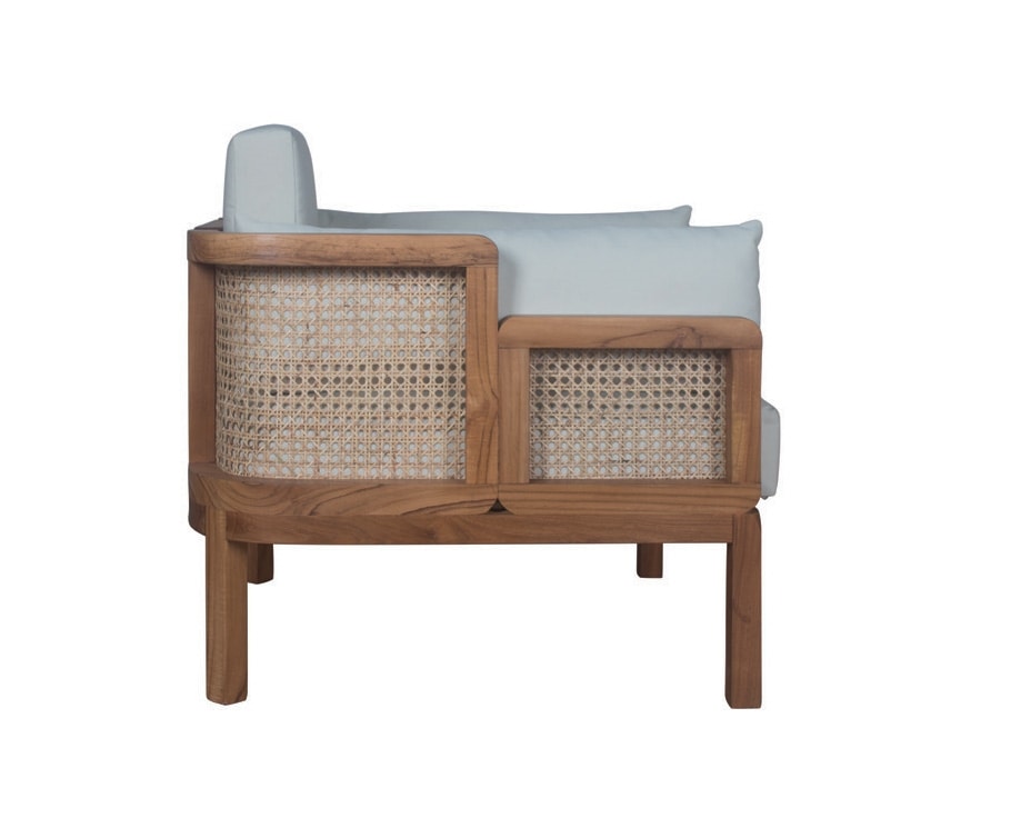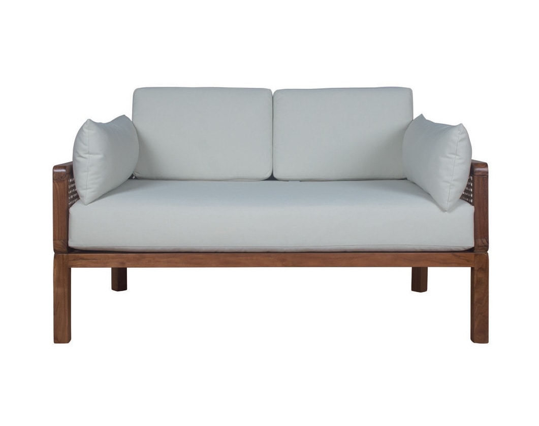 Canapé à deux places de la collection Dual, avec banquette arrière arrondie en rotin naturel tressé de Vienne et structure en bois de teck. La ligne représente la «dualité» entre le bois poli raffiné et le rotin naturel brut, combinés dans un seul meuble, alliant confort et beauté.