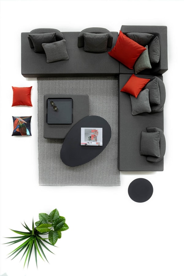 Canapé avec structure en aluminium. Dossiers amovibles avec structure en acier, galvanisé à chaud et thermolaqué (polyester). Assise, dossier et coussins avec revêtement amovible pour l'extérieur en tissu Olefin (100% polypropylène, 285g / m2), hydrofuge et résistant aux UV (7 grade), imperméable à l'intérieur avec revêtement en tissu (polyuréthane). Densité de rembourrage en mousse de polyuréthane pour le siège (38 kg m3), dossier en mousse (20 kg m3).