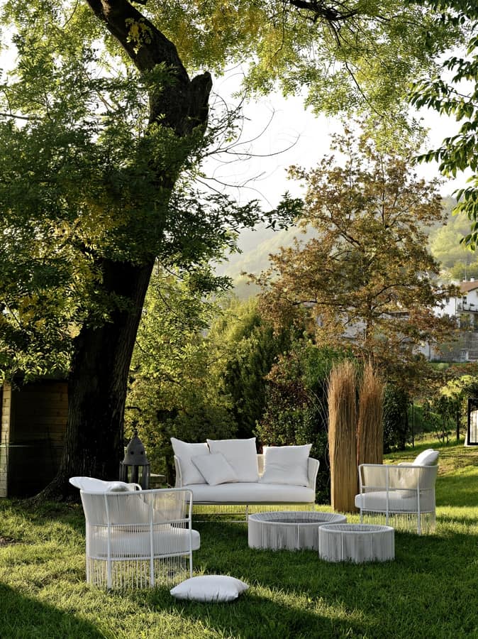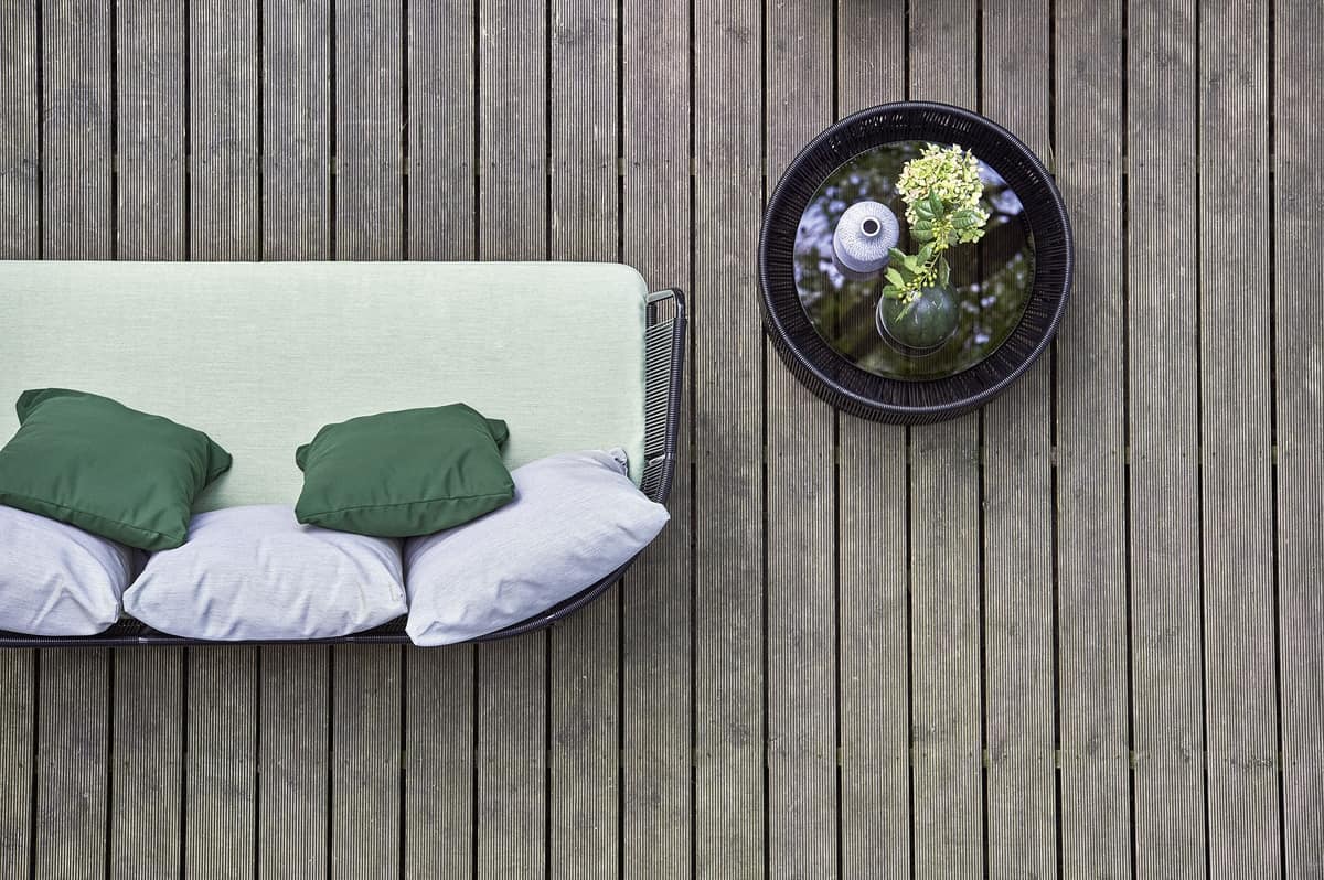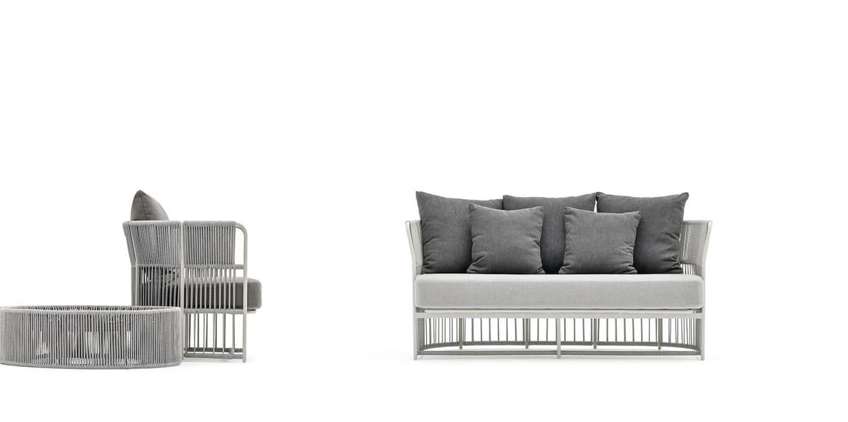 Canapé tressée à la main en fibre synthétique avec structure en aluminium verni.
