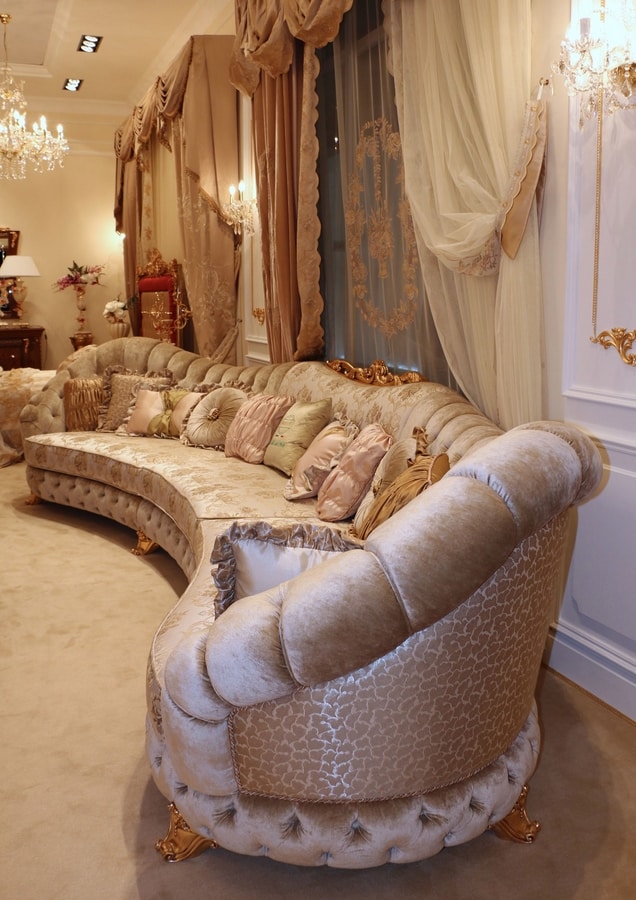 Canapé d'angle avec sculptures en bois massif, finition à la feuille d'or. Dos lisse ou capitonné avec boutons ou Swarovski.