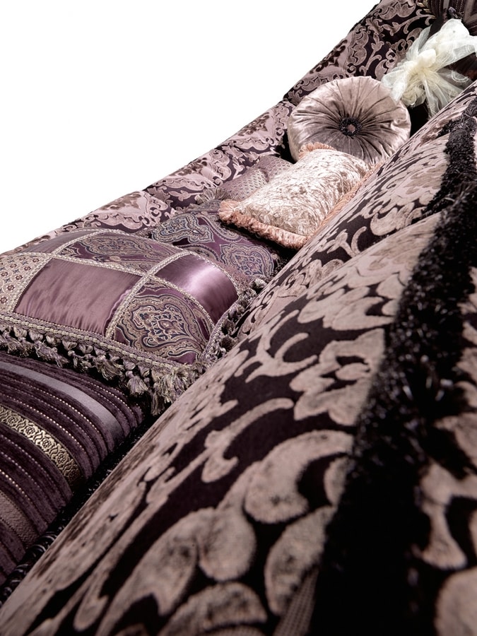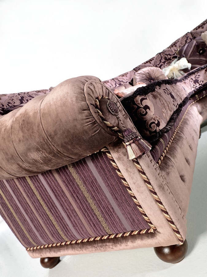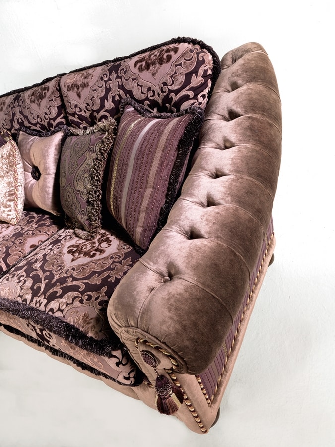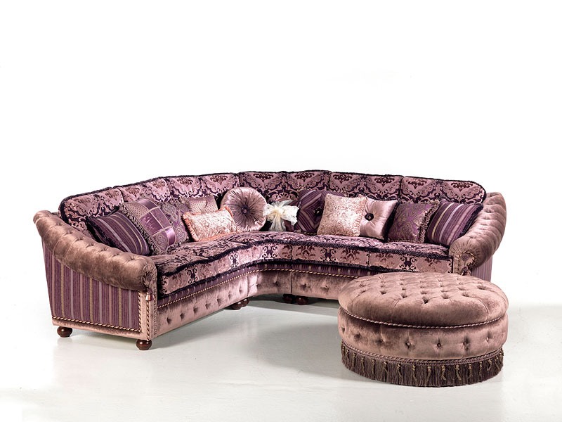 Canapé d'angle recouvert de tissu. Structure en bois massif. Accoudoirs avec décoration capitonné. Dimensions cm 250x250x89h pouf rond tapissé avec le tissu et la décoration 100x46h cm capitonné.
