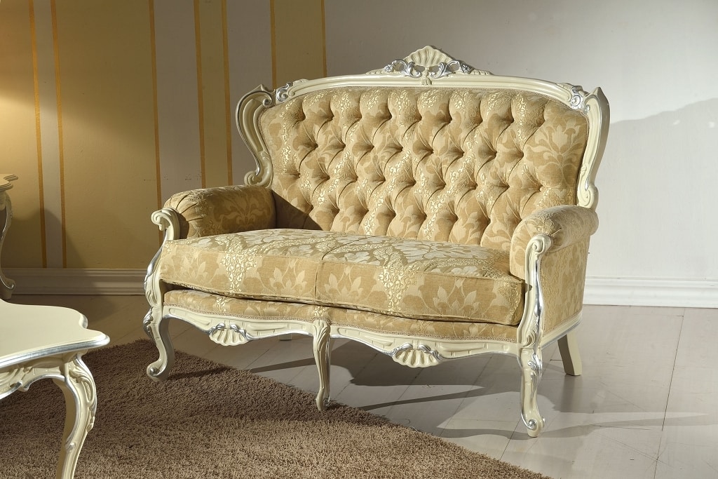 Canapé 2 places, de style classique. Structure en bois sculpté, finition laquée, avec détails argentés.