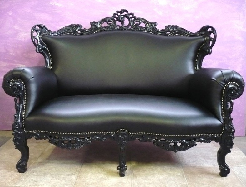 Canapé de style classique, avec structure en bois laqué noir, avec des sculptures artisanales. Revêtement en cuir.