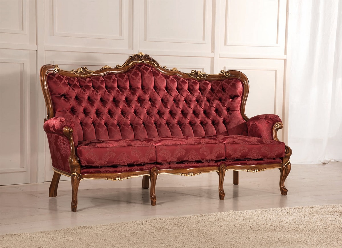 Canapé 3 places de style classique avec structure en bois sculpté. Dossier avec rembourrage capitonné.