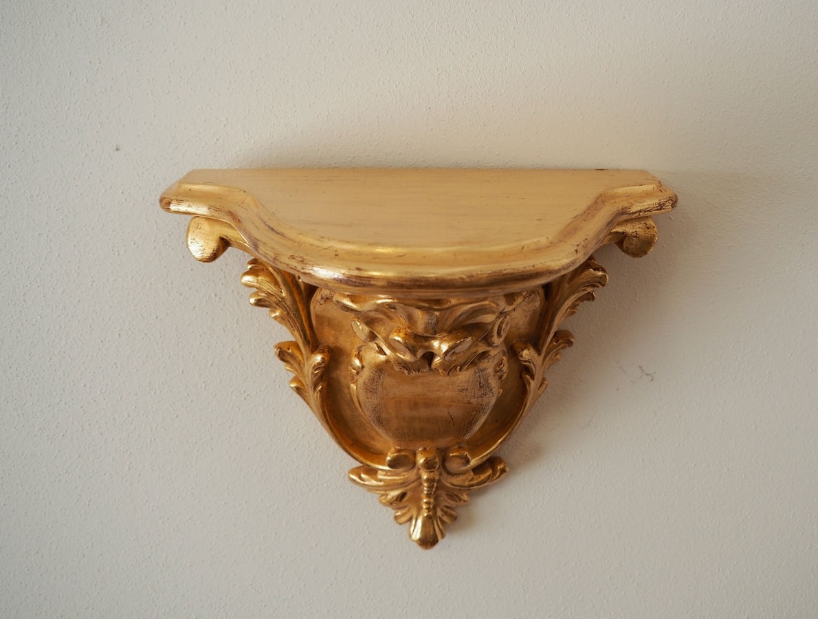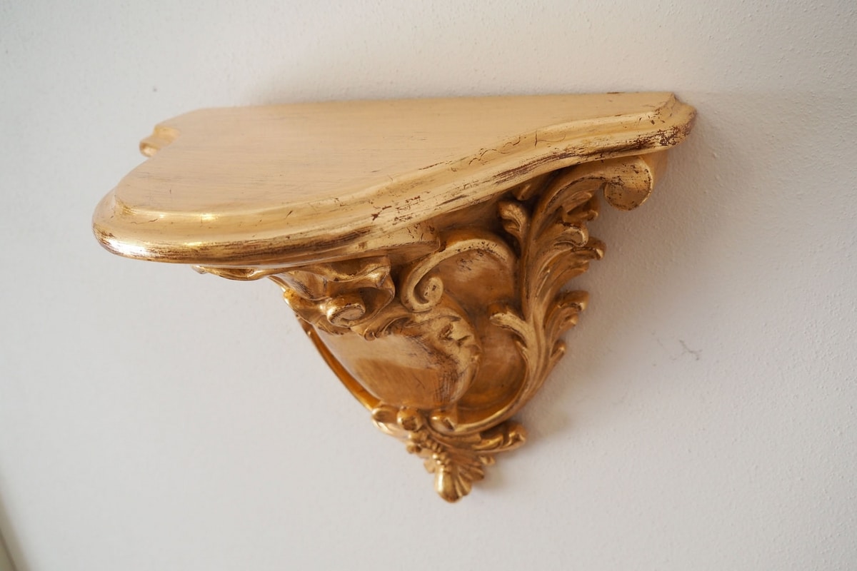 Charmante étagère pour porte-objets de collection. Finement sculpté à la main en bois de tilleul, gouache / eau dorée à la feuille d'or imitation. Mesures: H 30 cm x L 32 cm x P 21 cm