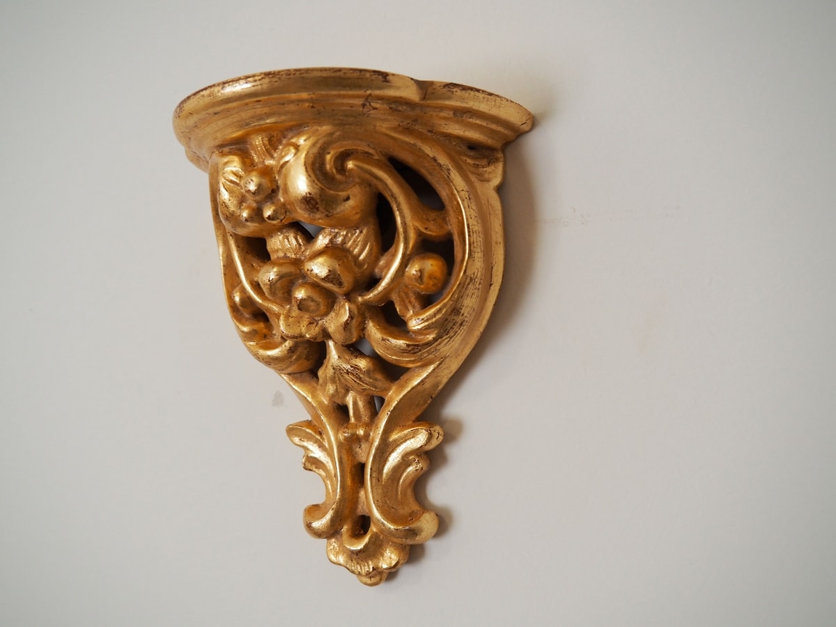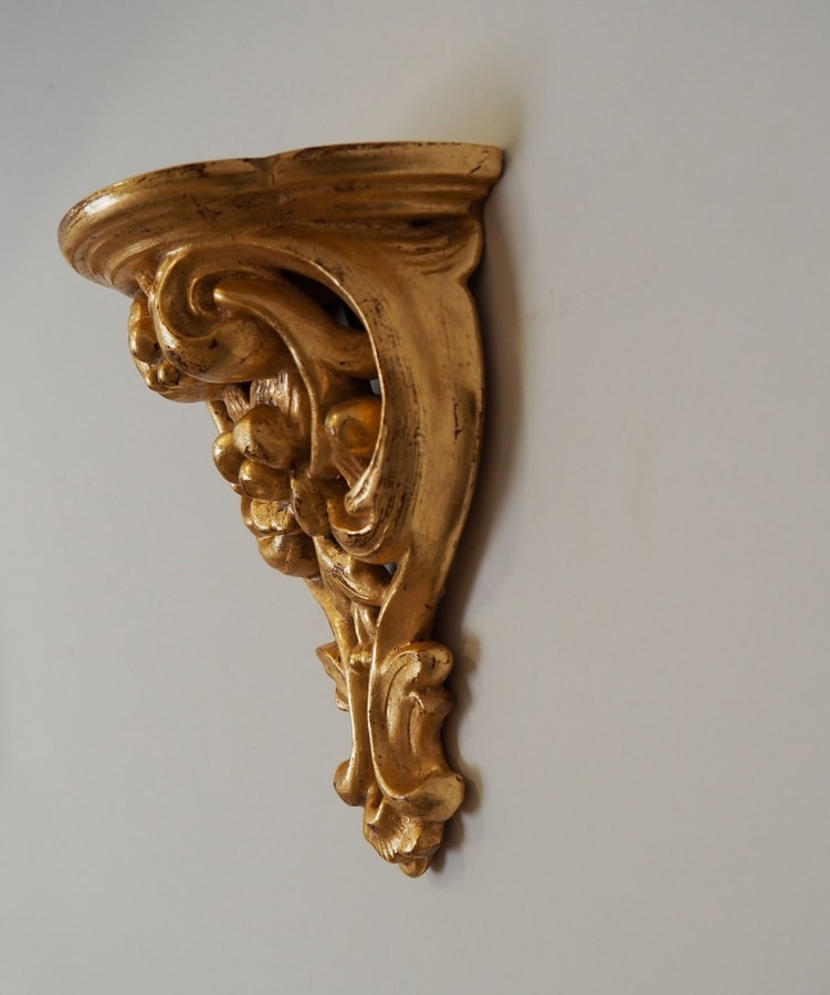 Charmante étagère pour porte-objets de collection. Finement sculpté à la main en bois de tilleul, gouache / eau dorée à la feuille d'or imitation. Mesures: H 17 cm x L 13,5 cm x P 8 cm