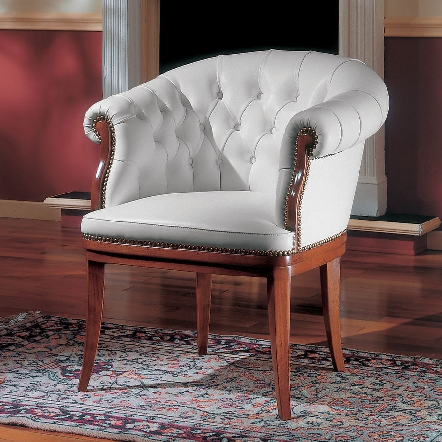 Cette chaise de bureau est idéale pour ceux qui recherchent un maximum de confort; la sellerie capitonnée standard rehausse particulièrement le luxe de ce modèle où l'on utilise des cuirs naturels de première qualité, teint à l'aniline, pleine fleur avec des pigments à effet bicolore, aspect semi-brillant.