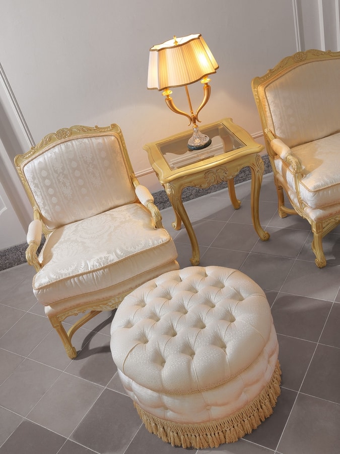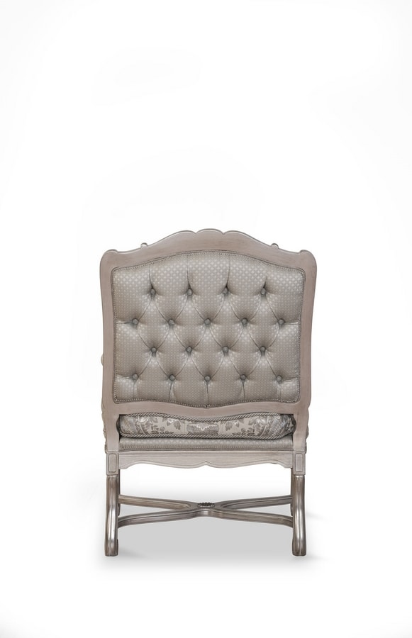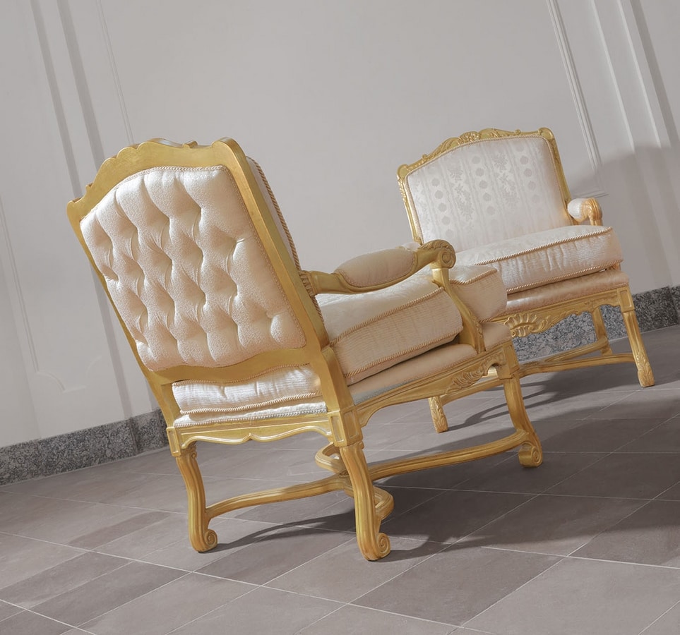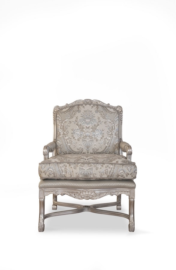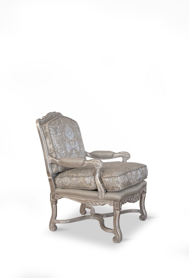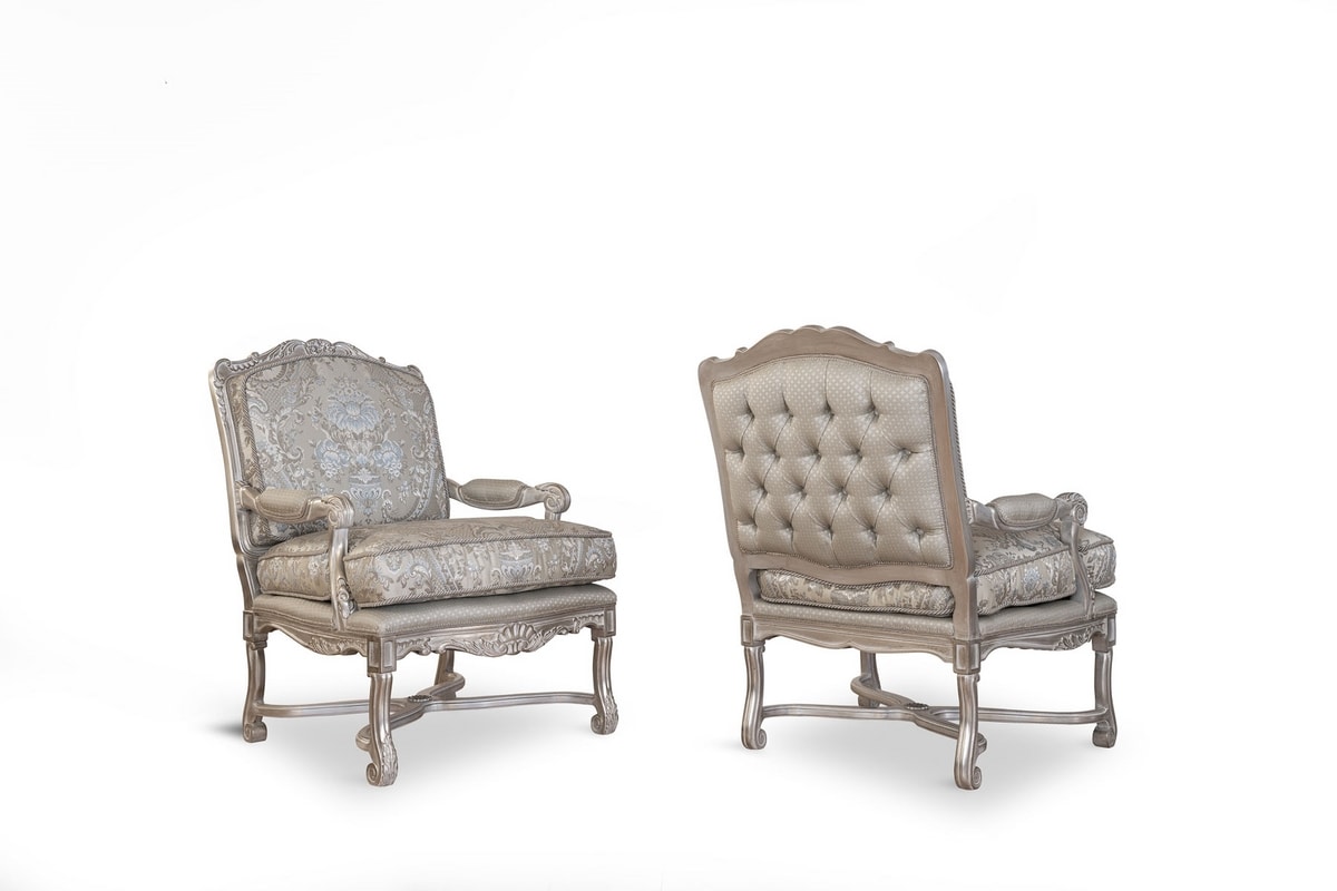 Fauteuil entièrement sculpté à la main avec une structure solide. Fabriqué avec les meilleurs tissus dans le respect de la tradition Made in Italy. Un large choix de finitions en bois et de tissus sont disponibles.