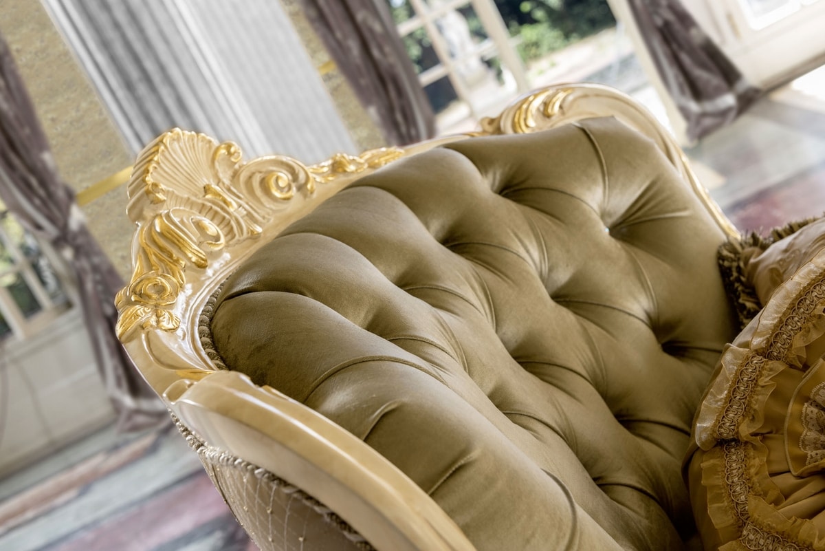 Fauteuil capitonné avec Swarovski. Structure en bois massif entièrement en feuille d'or, feuille d'argent ou beige patinée avec des détails de feuille d'or ou d'argent.