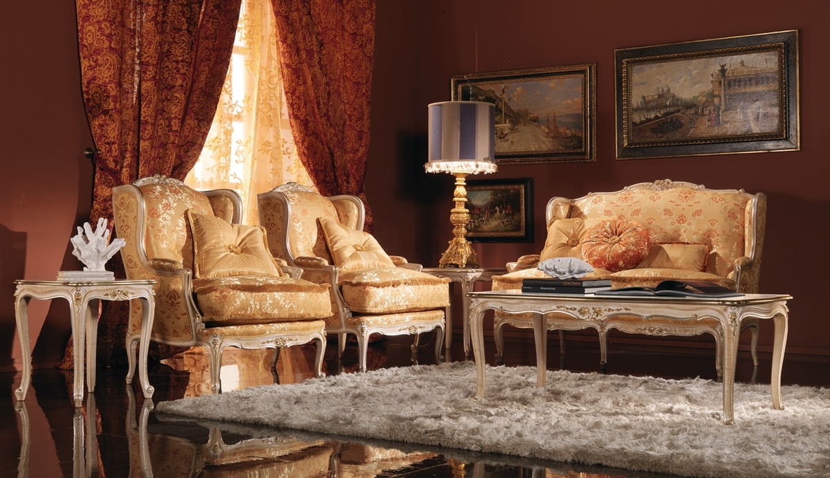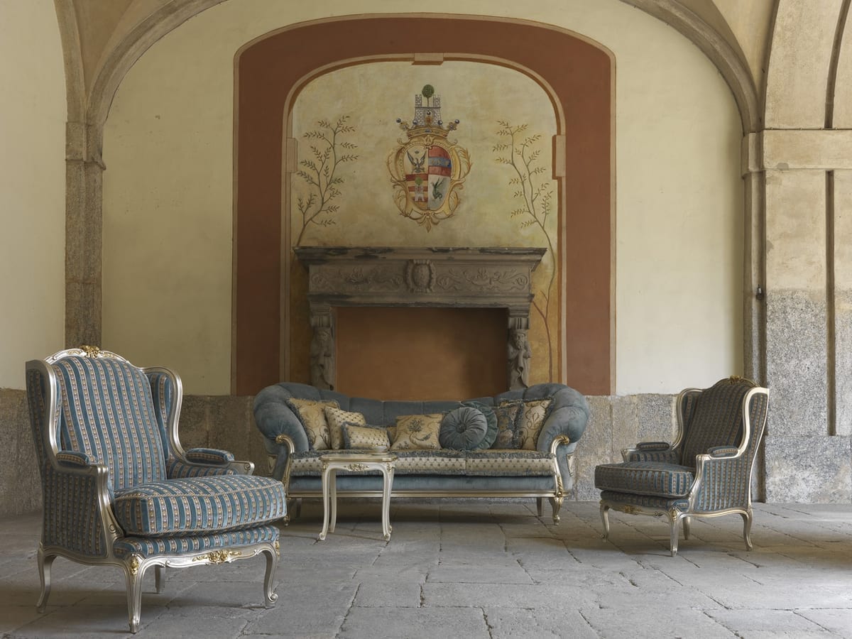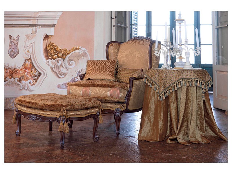 Fauteuil d'appoint pour usage résidentiel et contrat. Anna fauteuil avec revêtement en tissu et décapé fini noyer patiné. Dimensions: 76x81x102h cm. Le fauteuil est couplé avec le pouf de la même collection.