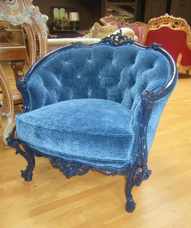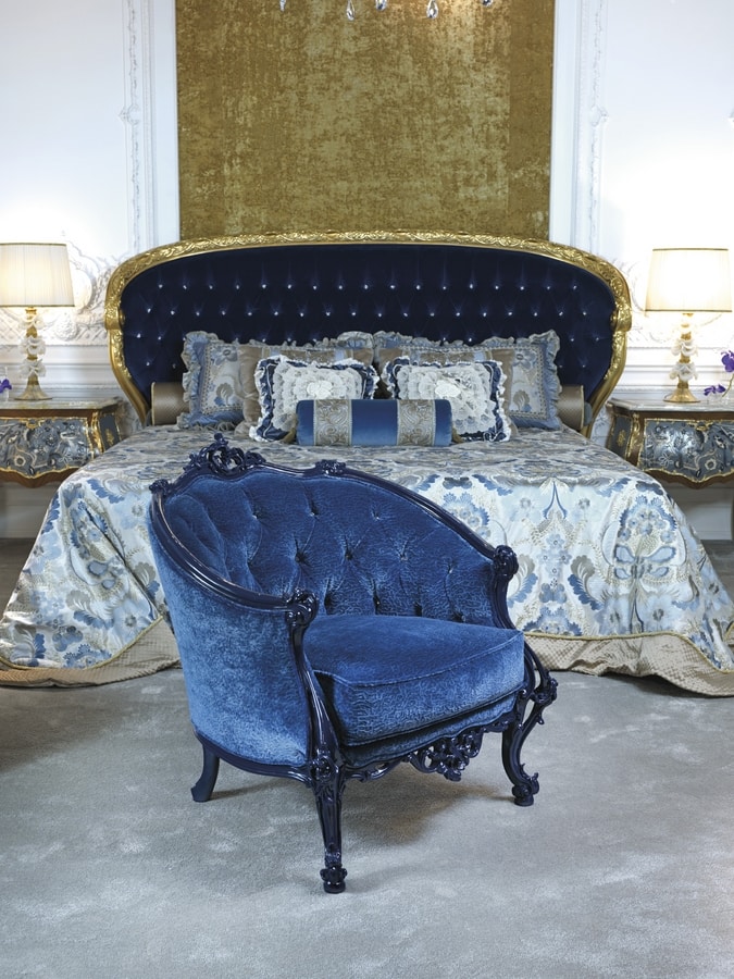 Fauteuil de luxe classique. la sellerie est en velours bleu, qui rappelle celle utilisée pour la tête de lit et le banc, capitonné à la main. La finition bleu vif lui donne une touche de modernité. Grâce à son élégance, il peut être utilisé dans des chambres à coucher ou dans des entrées importantes, accompagnant des accessoires de décoration prestigieux. Disponible dans d'autres finitions et revêtements.