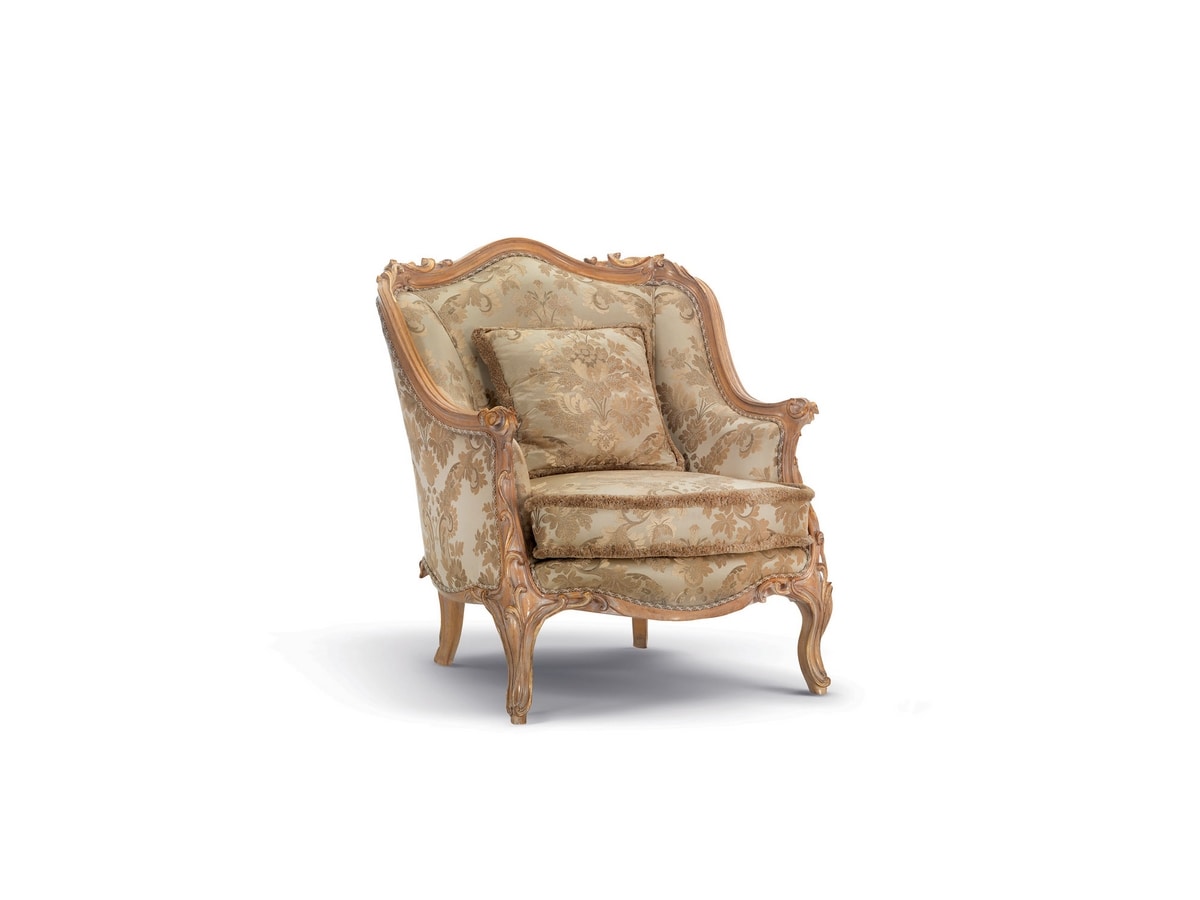 Fauteuil classique sculpté avec des formes élégantes. La qualité des matériaux et l'habileté qui transpire dans le traitement de la sculpture font de ce fauteuil un meuble classique et intemporel, destiné à durer au fil des ans.