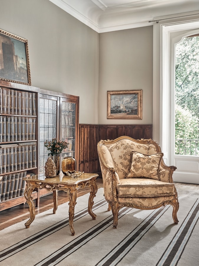 Fauteuil sculpté, finition décapée et feuille d'or antique. Housse non amovible.