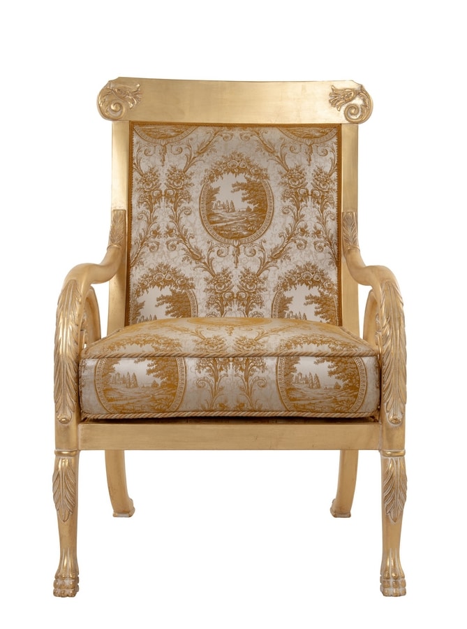 Fauteuil en bois sculpté, recouvert de tissu, finition OCH feuille d'or patinée blanc meringue (Oro Chic).