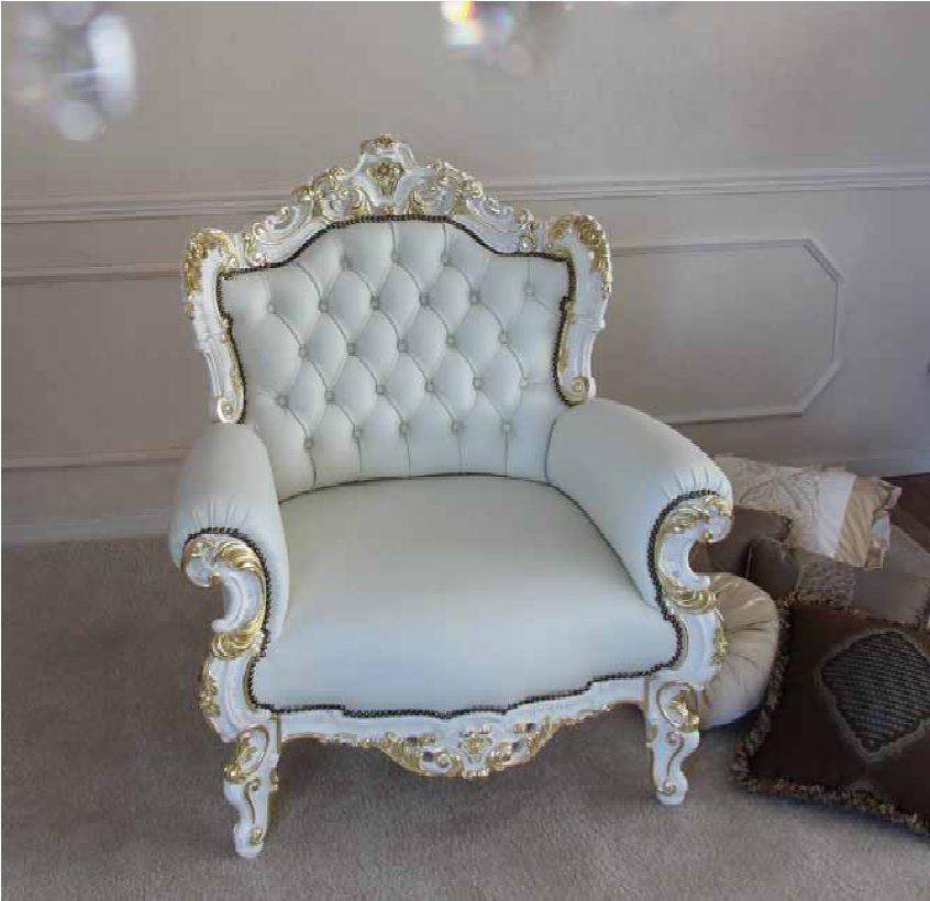 Fauteuil classique , avec une structure matelassée en arrière et bois avec des finitions de feuilles d'or . Idéal pour les environnements résidentiels .